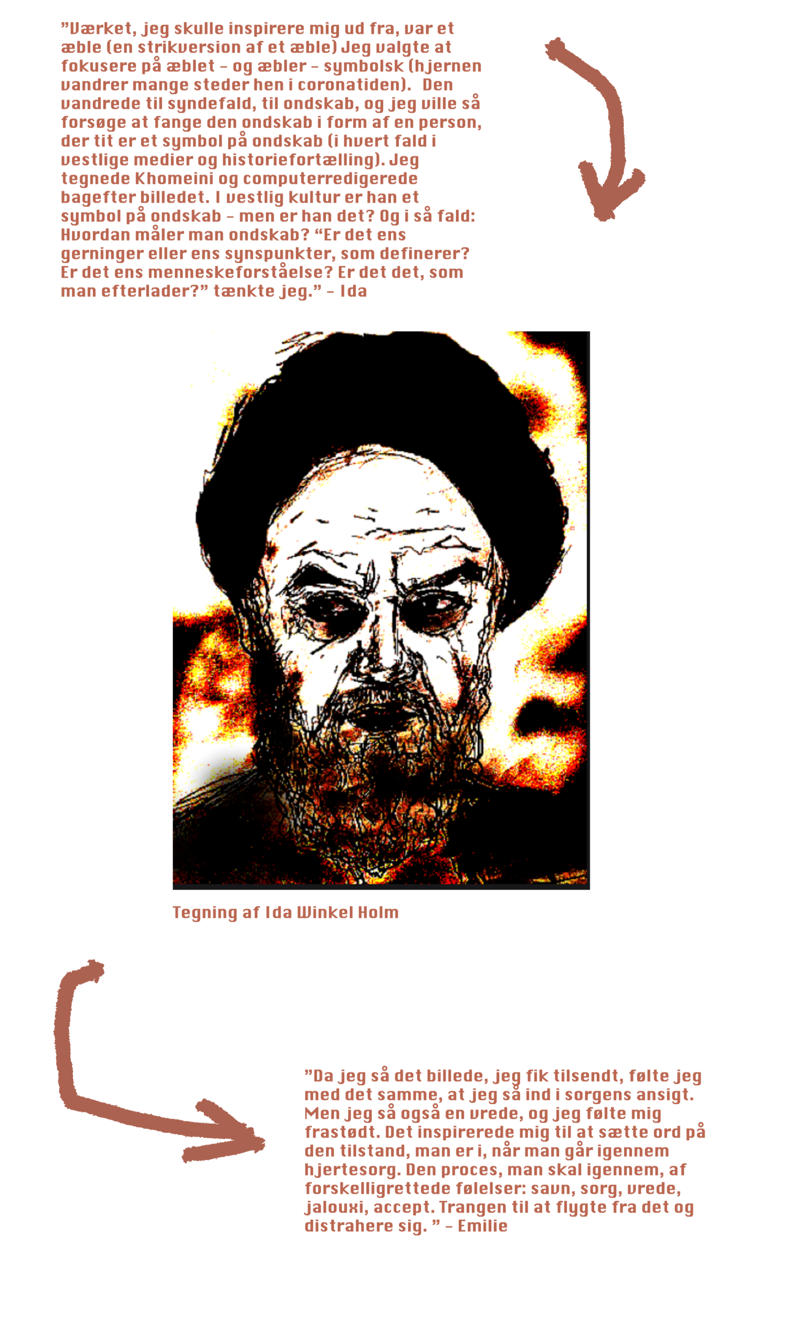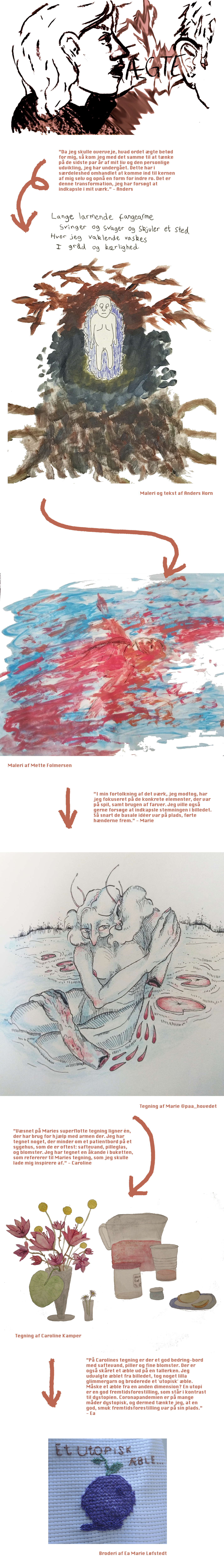 Første led i hver kæde fik tilsendt et ord – i dette tilfælde var ordet ÆGTE – som skulle agere inspiration for 1. leds kunstværk. Vi sørgede for at sende dette link videre til 2. led, som lavede et nyt værk med inspiration fra det forrige kunstværk. Igen sendte vi værket videre i kæden osv. osv. osv.