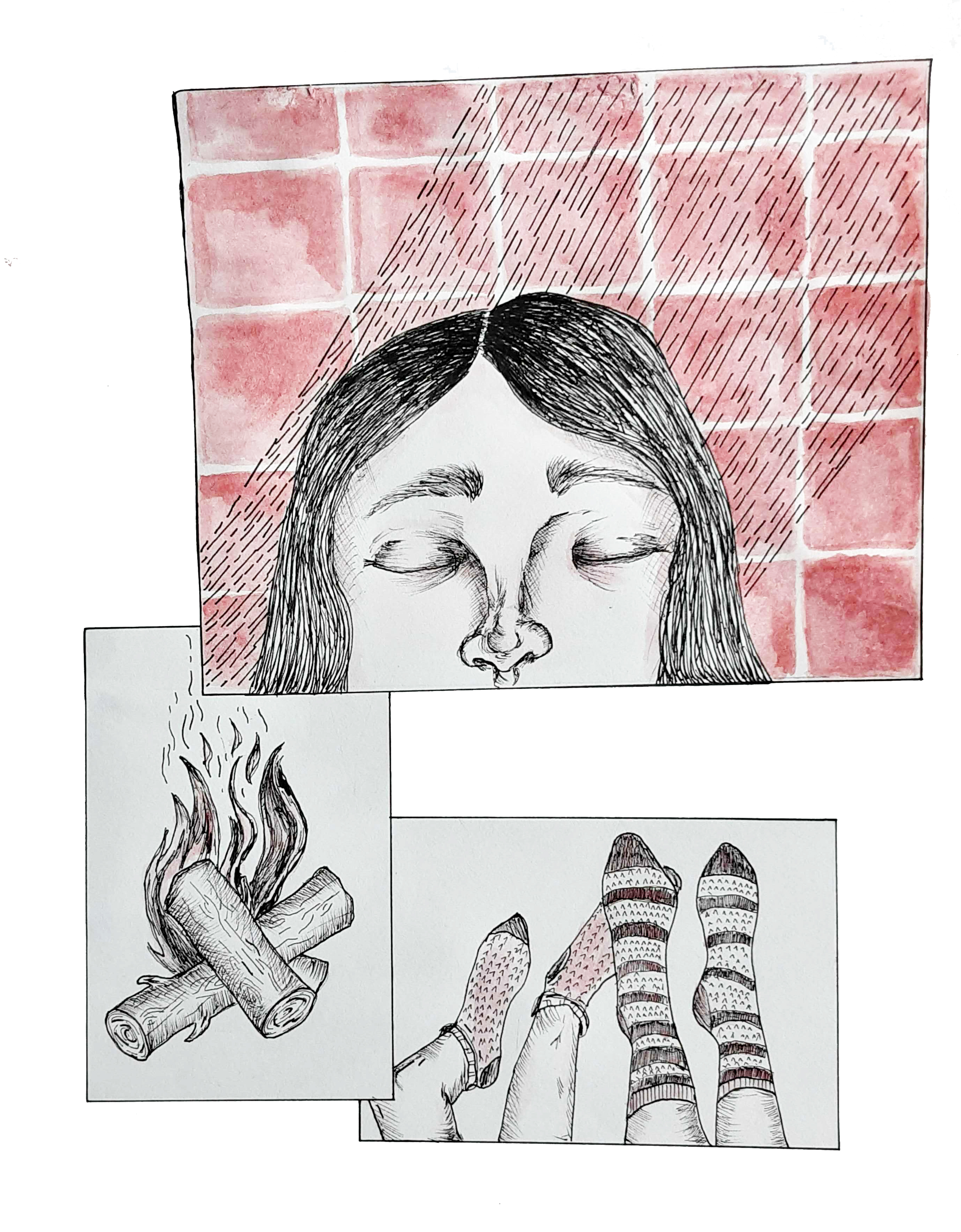 Jeg stod i badet, for her kunne jeg finde fred og plads til mig selv. Jeg havde haft brug for alenetid. Det har jeg sommetider. Det kolde vand faldt langsomt fra brusehovedet, og jeg fik gåsehud på benene. Når jeg er alene, kan jeg finde ro til at samle mig og mine tanker efter dagens mange indtryk og til at føle efter hvor langt jeg er fra mig selv. Jeg gennemgår hvor mange hatte jeg har haft på i løbet af ugen og tænker på, om de alle var mine. Har jeg mon påtaget mig en rolle for meget, så den ikke længere er min. Ronja og jeg har været venner længe, men nogle gange føler jeg at hun næsten ikke kender mig. Hun ved aldrig hvornår hun skal stoppe med at presse på. Indimellem overrasker hun alligevel med hvor tydeligt hun kan aflæse, hvad jeg tænker og hvorfor. Hun er den bedste til at gennemskue mine masker og til at finde frem til hvad der gemmer sig bag.