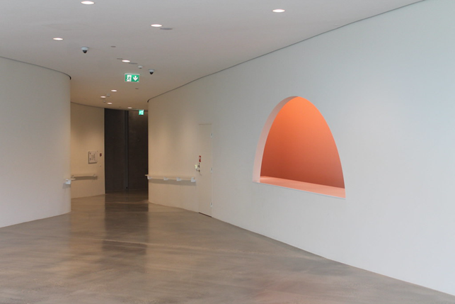 Udstillingen er placeret i et stort åbent rum med små “nicher” ind til små mørke rum. Væggene er store, kolde og golde. Rummet føles som skibet på en katedral, du lander i under en flugt fra varmen på en ferie i de varme lande. Bare tomt. Alle detaljer er barberet af med små afbræk af store farverige malerier.