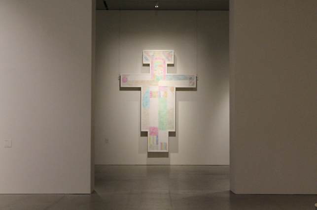 Som et uundgåeligt centrum, der kræver din opmærksomhed, hænger et kæmpe korsformet maleri ved slutningen af udstillingen. Man kan nærmest se det med det samme, når man kommer indenfor.