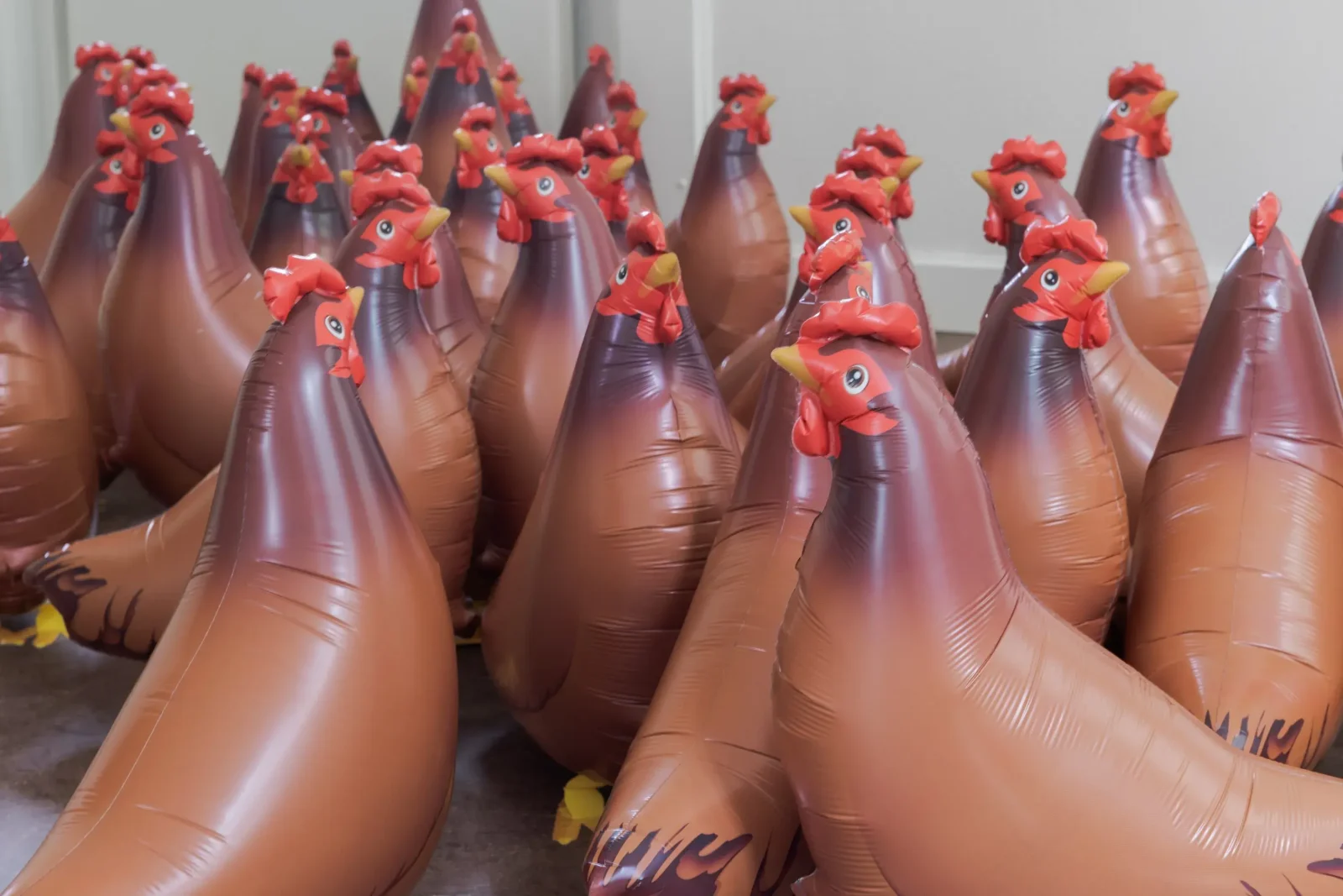 Da jeg besøger udstillingen er en enkelt høne kommet på afveje, den har mistet sine fødder og hænger op under loftet. En museumsansat forsøger at få den ned igen på jorden, og han fortæller, at det tit sker. I retroperspektiv tænker jeg, at det kan være denne chick’s forsøg på at efterlade sit populære pigenavn og flygte fra patriarkatet? Det forbliver uvist, og hønen kommer tilbage til sin flok.