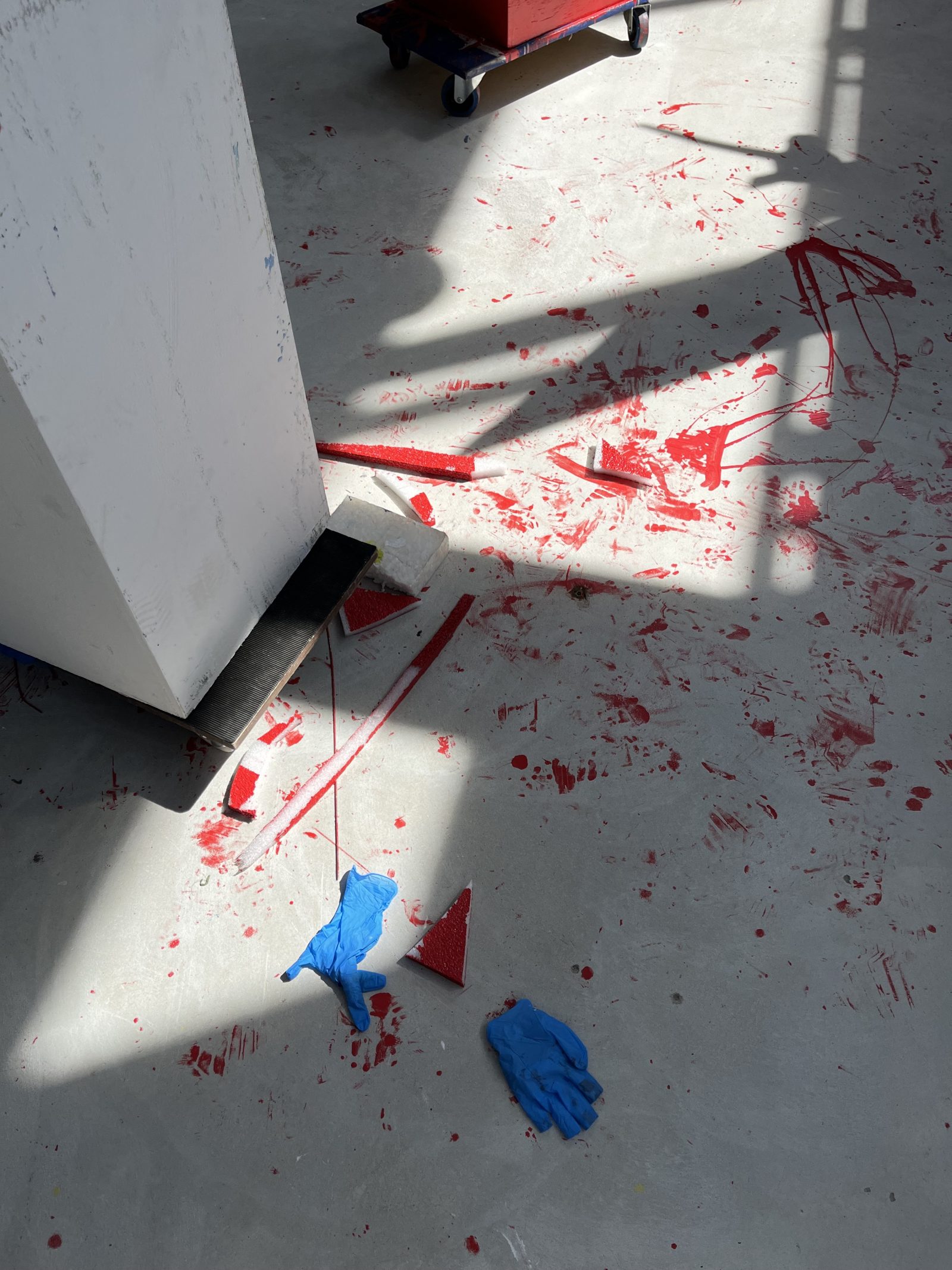 Som seer på DRs program ‘Kunstnerkolonien’, hvor Næblerød medvirker i sæson 1, fangirler jeg lidt over muligheden for at kunne møde ham. Men som en anden Hans og Grethe er Næblerød ikke til at spotte denne dag, og jeg er efterladt med brødkrummer fra hans arbejdsproces. Heldigvis er der mange af dem. Spredt hen over gulvet er røde malerstænk- og klatter, og det flyder med blå gummihandsker, hvilket får ARKENS grå gulv til at ligne noget fra en mordscene. Næblerøds energiske og spontane praksis ses tydeligt afspejlet med indtørrede pensler og halvfærdige malerier på staffelier, som nogle dage kan se i brug – live og in action.