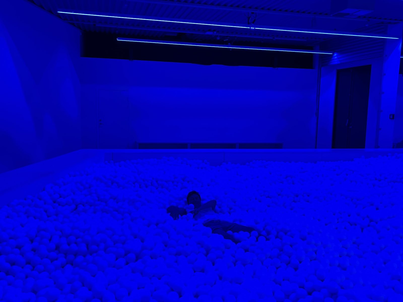 Det sidste på min vej er et bassin fyldt med plastikbolde, som til forveksling ligner noget fra mine barndomsbesøg i Løvens Hule (nu Leos Legeland). Her kan man tage sine sko af, smide sig ned i boldene eller kaste dem på andre (med deres samtykke, hvis man ikke kender dem). Jeg graver mig ned i poolen og kommer op igen med en anden farve museumsklistermærke end oprindeligt. Måske er det muligt at blive forvandlet til et barn eller VIP-gæst i det blå hav af plastikkugler, tænker jeg.