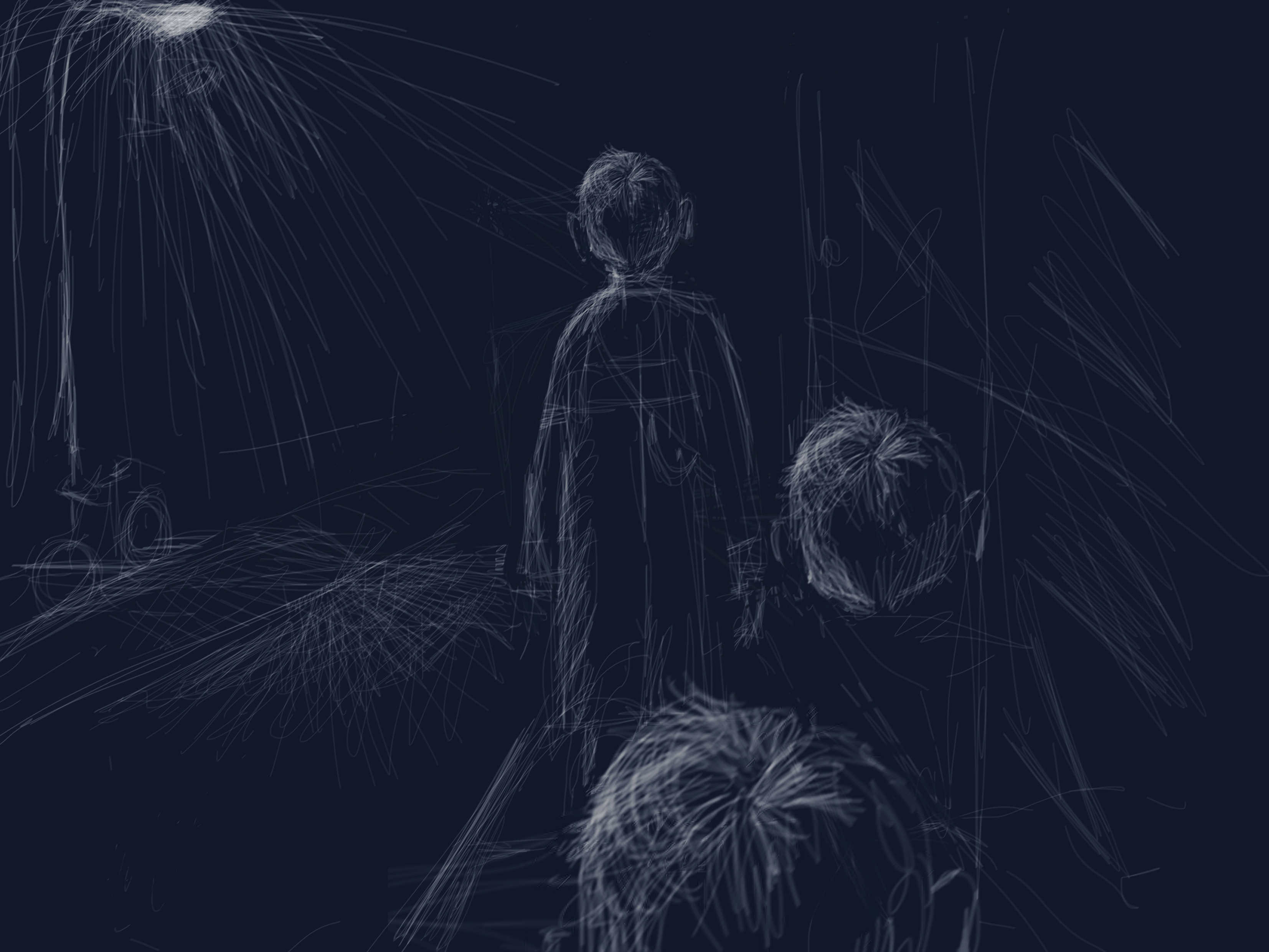 Jeg flygter når vi skændes. Flygter ned på gaden for at få vejret. Under lygtepæle der som lommelygter forfølger mig. Peger mig ud. Og stilheden. Den stilhed omkring en der får hovedet til at larme. En tinnitus. Den bærer din stemme.