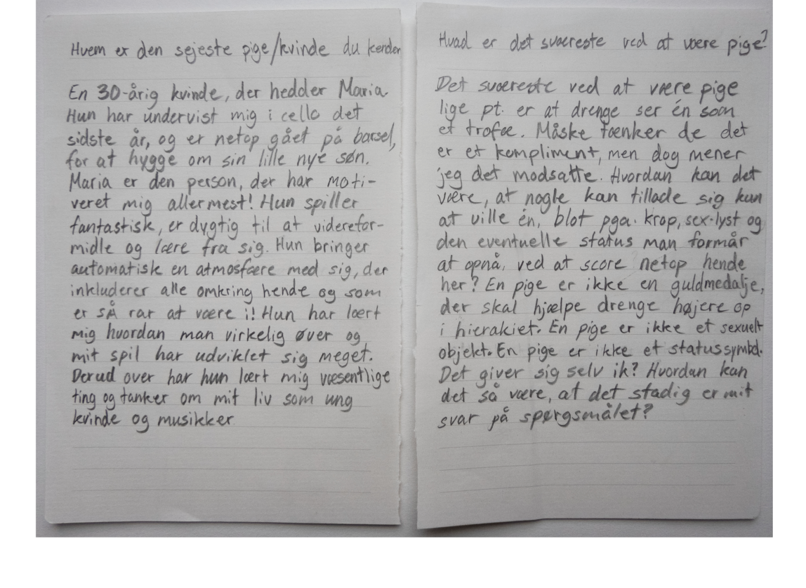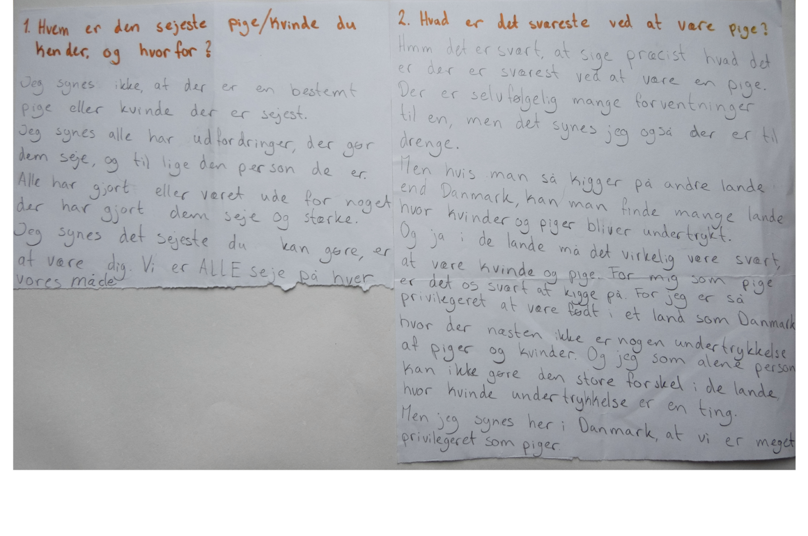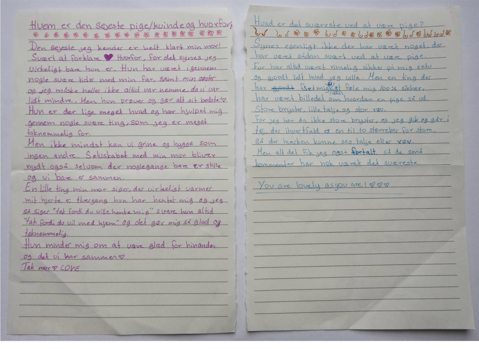 Og bad dem skrive svarene ned, med egen håndskrift, på et papir og give det til mig. Jeg har fotograferet alle pigernes forskellige svar. Alle svar er vidt forskellige, men er alle relevante, relaterbare og henvender sig til piger/kvinder i alle aldre.