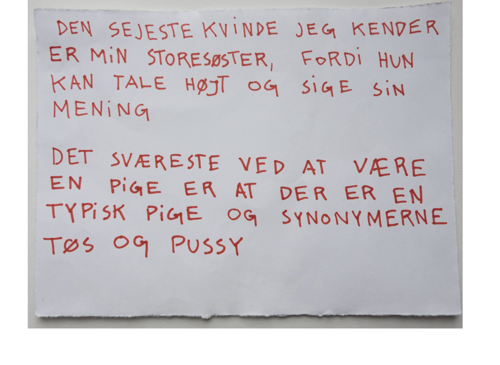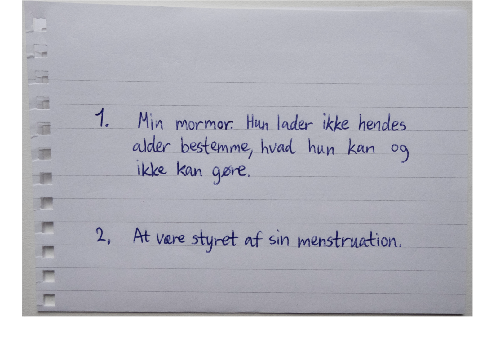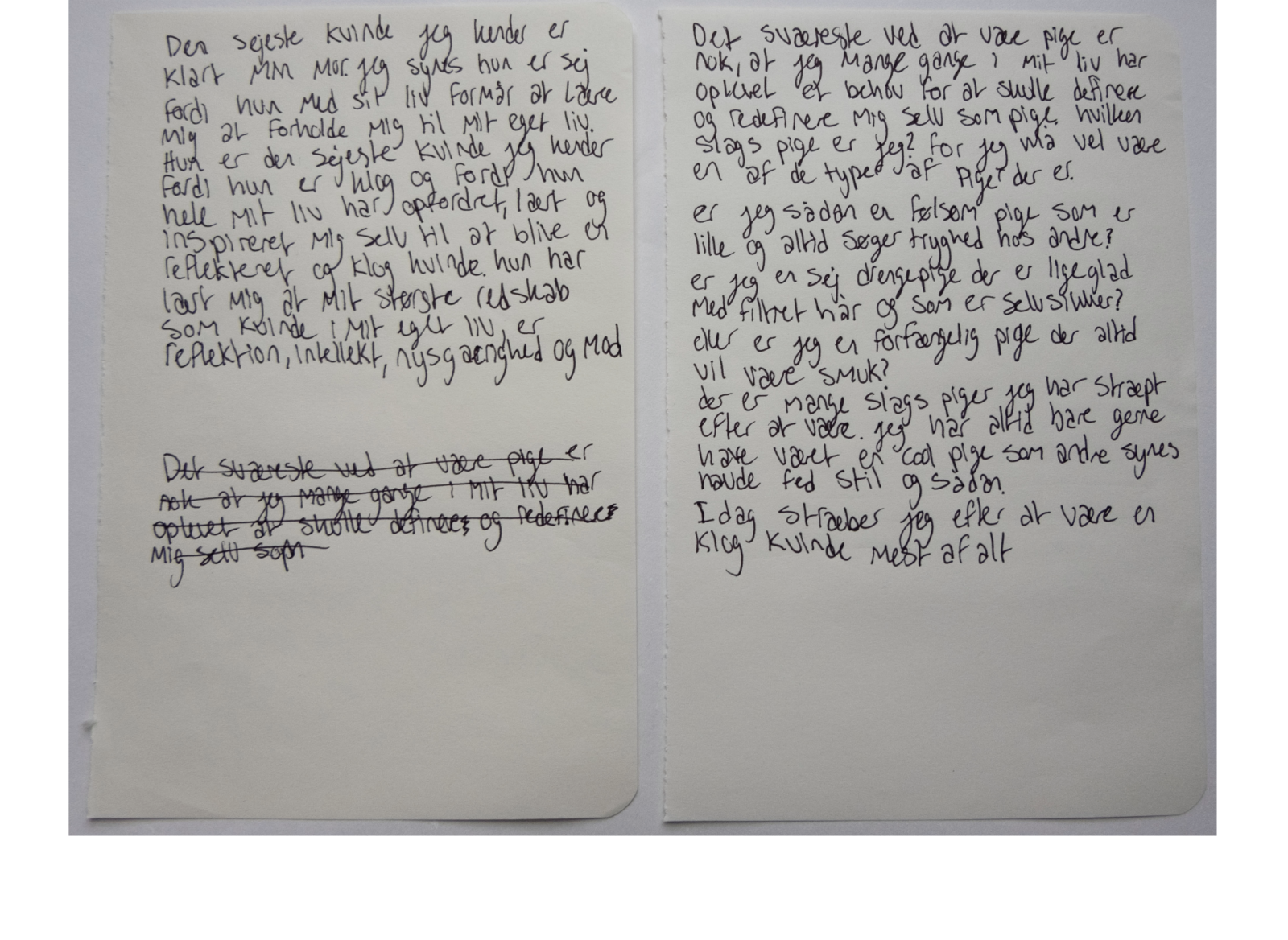Og bad dem skrive svarene ned, med egen håndskrift, på et papir og give det til mig. Jeg har fotograferet alle pigernes forskellige svar. Alle svar er vidt forskellige, men er alle relevante, relaterbare og henvender sig til piger/kvinder i alle aldre.