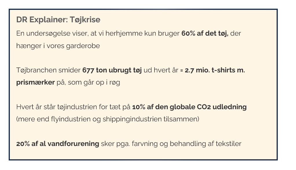 Jeg får selv mine nyhedsopdateringer fra medier som DR, hvor jeg finder det altafgørende, at jeg bliver fortalt den mest sandfærdige fortælling om, hvad der foregår ude i verden. Gennem DR’s egen serie Explainer er jeg blevet oplyst om tøj-industriens enorme klimaaftryk. Her fandt jeg ud af, at tøj-industrien hvert år står for tæt på 10% af den globale CO2 udledning. Det er mere end fly-industrien og shipping-industrien tilsammen. Derfor undrer det mig, at DR – selv om de ligger inde med den afgørende viden – alligevel har valgt at producere et underholdningsprogram, som drejer sig om ny produktion og design af tøj uden sammenkobling til det enorme klimaaftryk, branchen sætter. Det er ikke nok, at DR formidler klimaudfordringerne på deres andre platforme. Vi burde ikke længere have den luksus at vælge, hvornår klima skal spille en rolle. Derfor synes jeg, at DR og andre medier svigter sit ansvar i deres programmer.