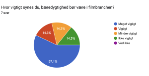 Jeg har spurgt i mit netværk om folks erfaringer med bæredygtighed i filmbranchen. Selvom undersøgelsen ikke er repræsentativ, giver den stadig indblik i tendenser og holdninger i branchen. Blandt syv respondenter med forskellige roller, svarer 57,1%, at de synes bæredygtighed bør være meget vigtigt, og kun 14,3% svarer, at de ikke synes, det bør være vigtigt. Størstedelen af respondenterne har erfaring fra branchen i 1-3 år, hvilket antyder, at der allerede tidligt er opmærksomhed på bæredygtighed i en filmskabers karriere.