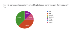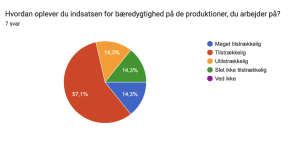 Ligeledes oplever 57,1%, at indsatsen for bæredygtighed er tilstrækkelig. En af respondenterne skriver blandt andet, at der bliver gjort en indsats gennem brug af drikkedunke, genanvendeligt bestik og planlægning af transport.
