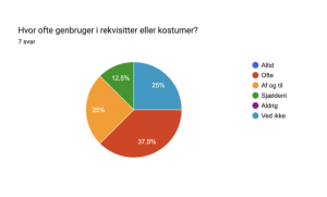 Hvis du skal bygge scenografi så brug genbrugsmaterialer eller mal over allerede eksisterende løsninger og lej kostumer og rekvisitter frem for at købe nyt – det kan ofte lejes fra teatre eller andre produktioner. Du kan også spørge i dit netværk, om noget kan lånes eller lejes. Efter optagelserne er færdige, kan rekvisitter og kostumer med fordel gemmes til andre produktioner, privat brug eller gives videre til genbrug.