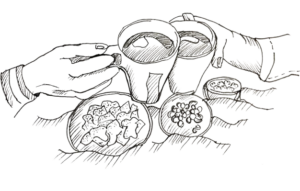 Da jeg ankommer i mørket, står Karoline i døren: ”Jeg har iste på køl”, siger hun og fylder et ekstra glas til mig, mens jeg smider støvlerne i gangen. Jeg griner: ”Jeg har alt for mange snacks med igen”. Og så bekræfter vi hinanden i løgnen om, at vi jo ikke behøver at spise alt sammen på én gang.