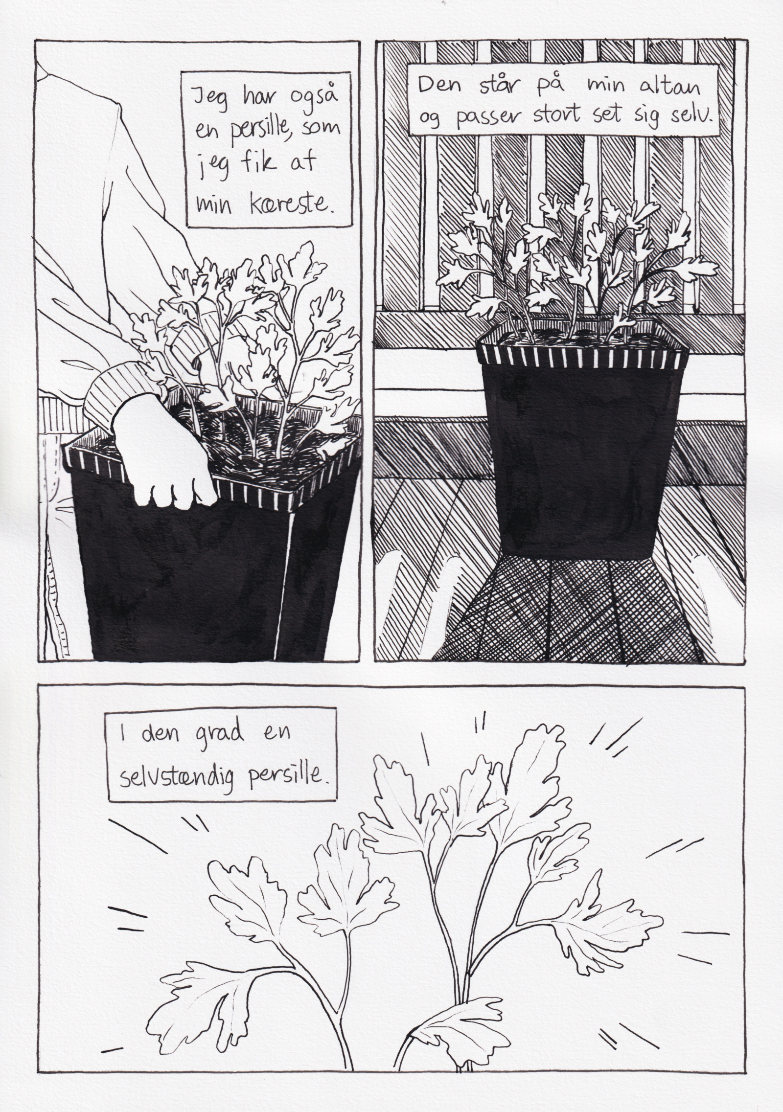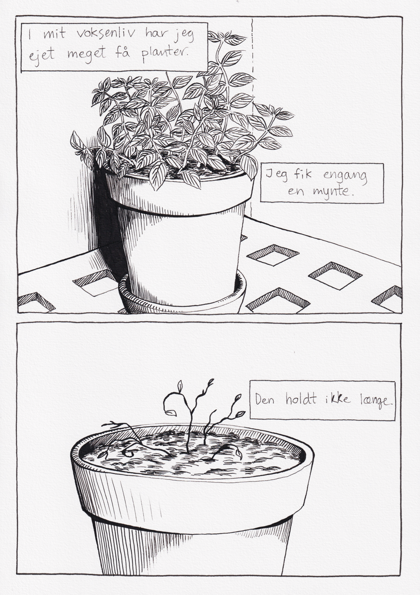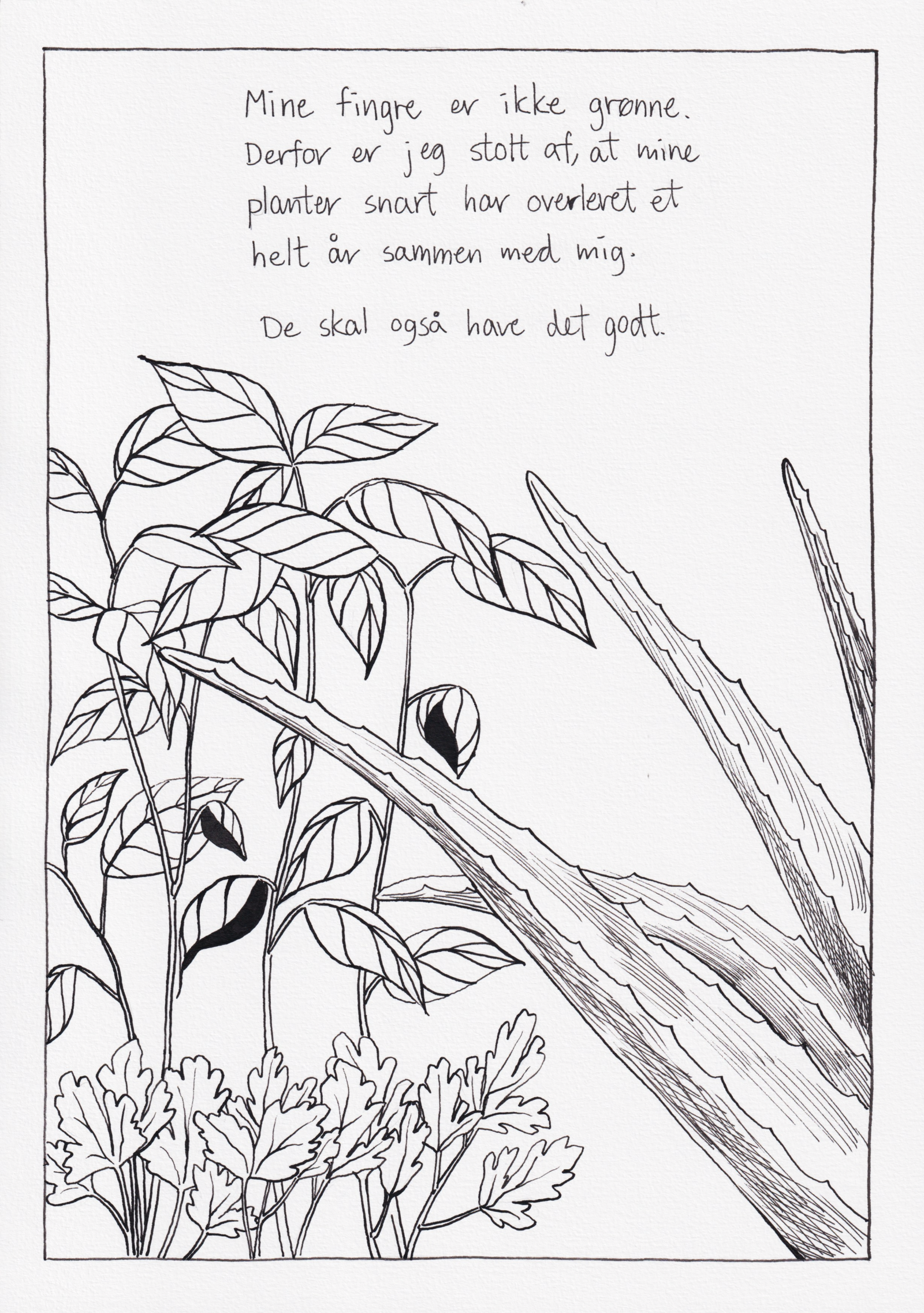 I begyndelsen af coronakrisen besluttede Anine sig for at isolere sig selv så meget som muligt. Men er man en kreativ sjæl, kan det være svært at føle sig inspireret, når man har lukket sig inde bag hjemmets fire vægge på ubestemt tid. Anine rettede sin opmærksomhed mod sine planter, som er blevet til hovedpersonerne i denne korte tegneserie.