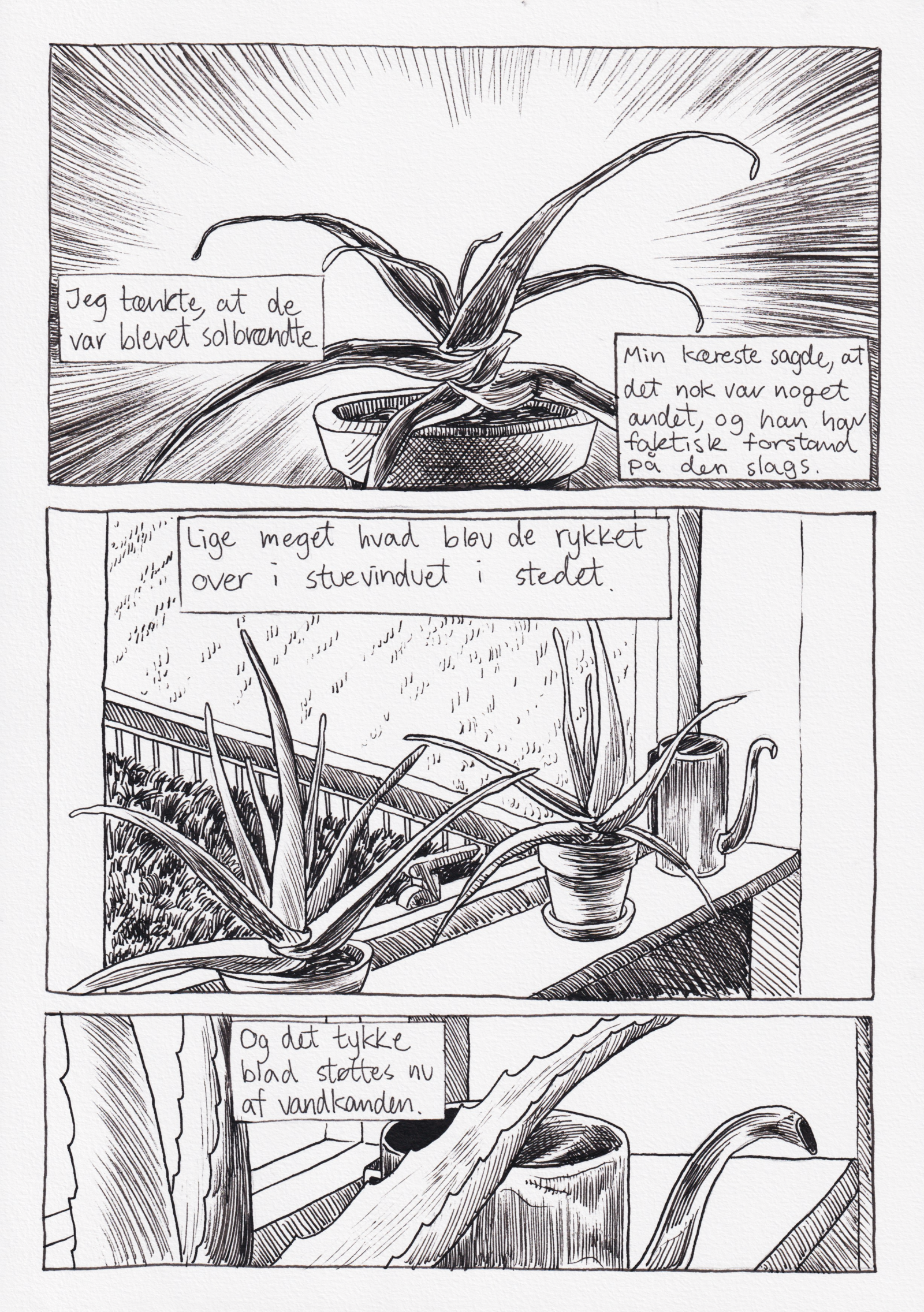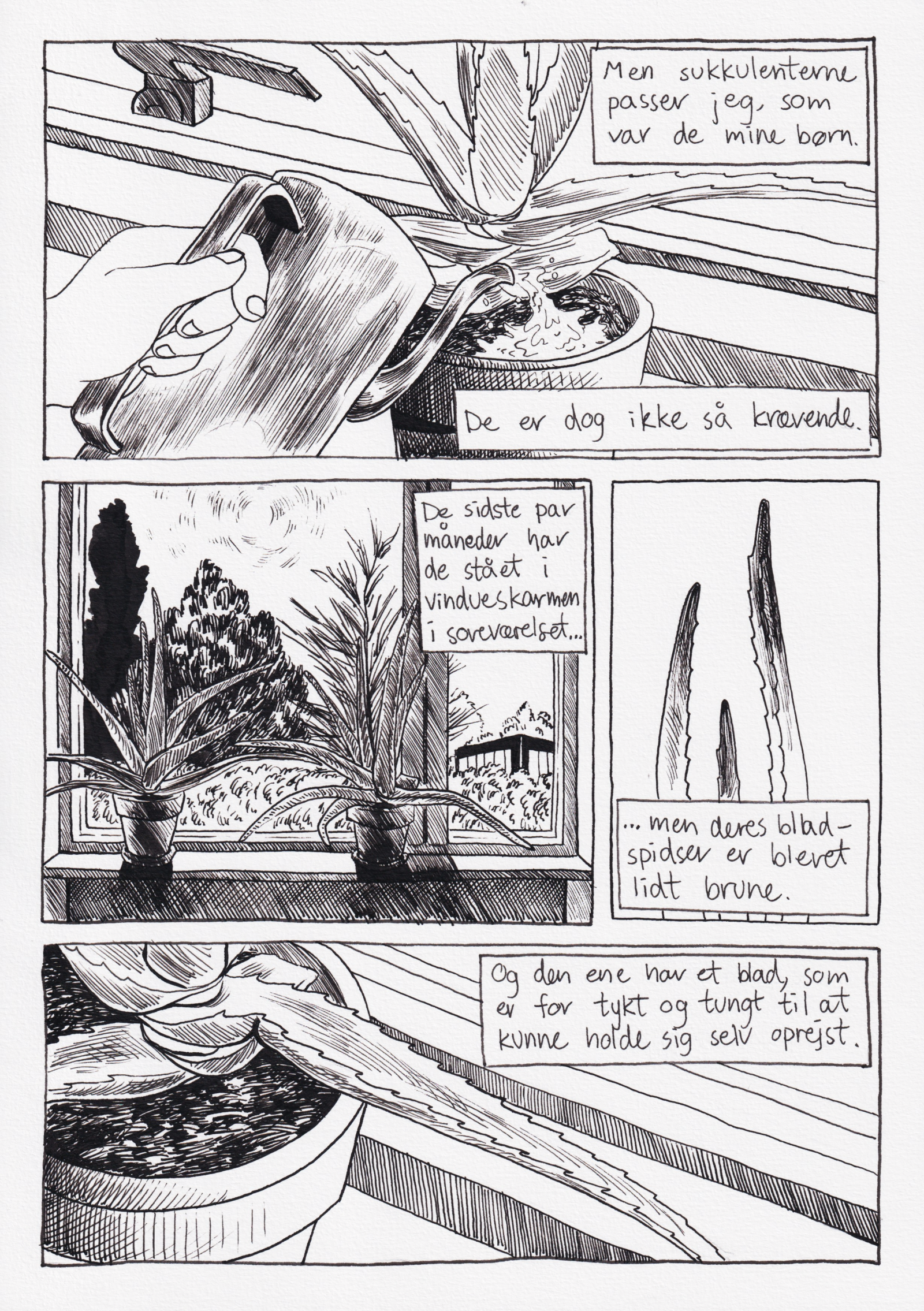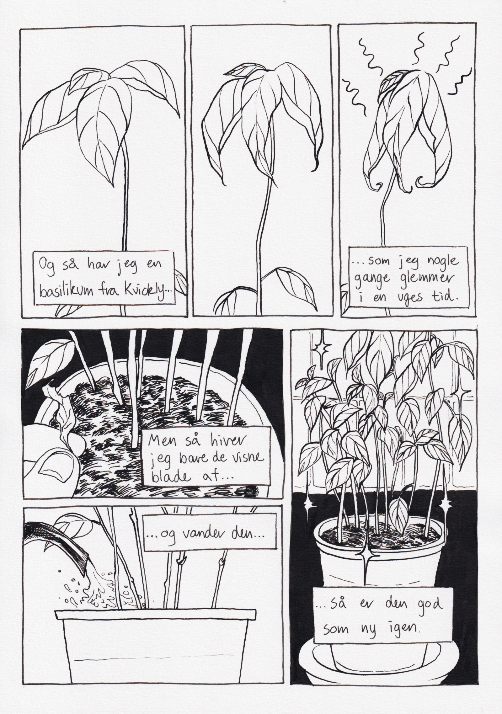 I begyndelsen af coronakrisen besluttede Anine sig for at isolere sig selv så meget som muligt. Men er man en kreativ sjæl, kan det være svært at føle sig inspireret, når man har lukket sig inde bag hjemmets fire vægge på ubestemt tid. Anine rettede sin opmærksomhed mod sine planter, som er blevet til hovedpersonerne i denne korte tegneserie.