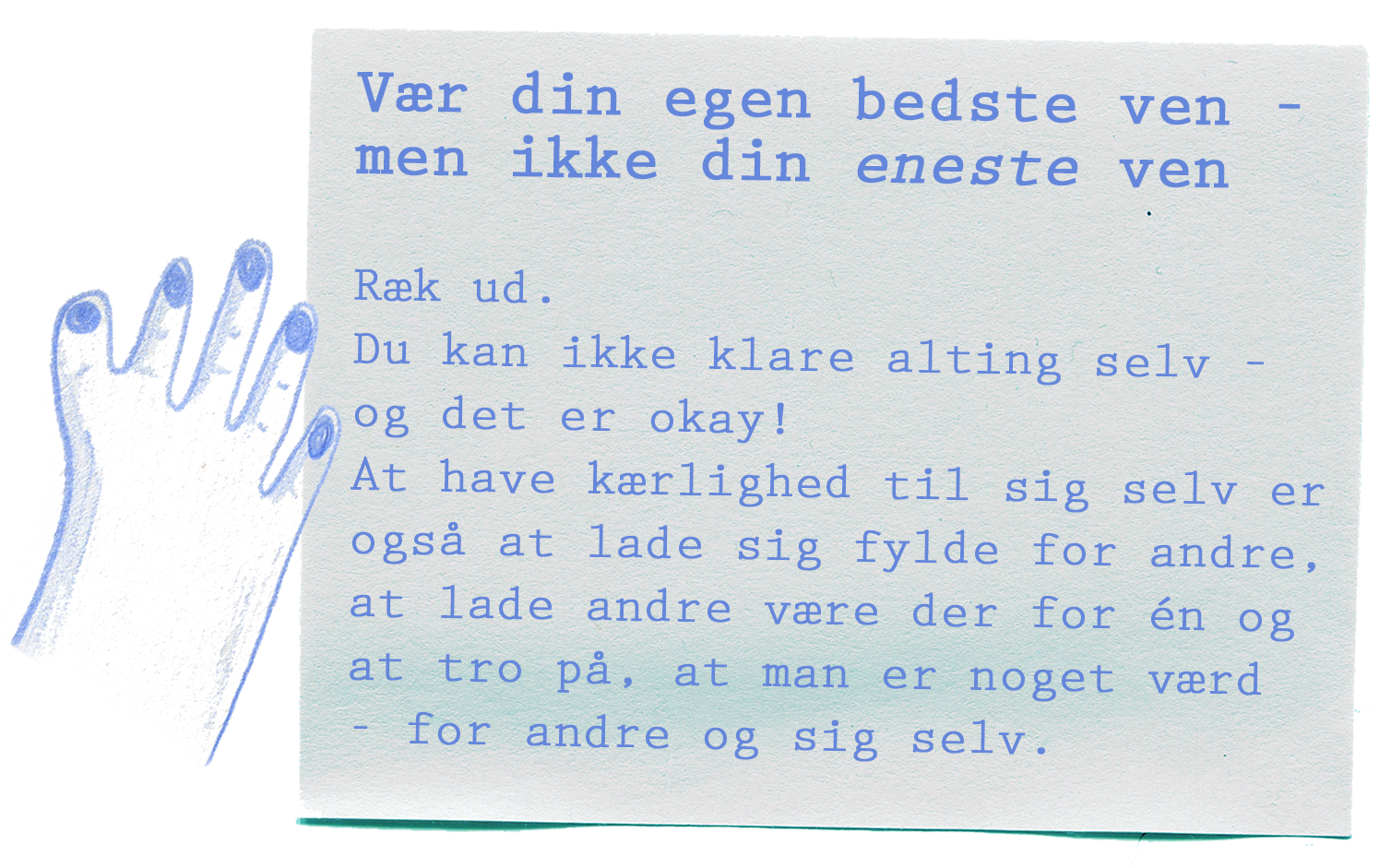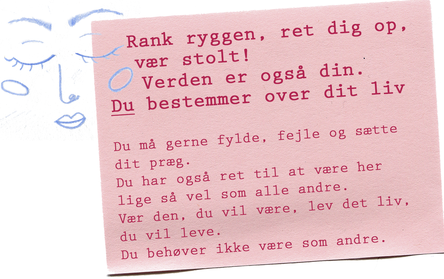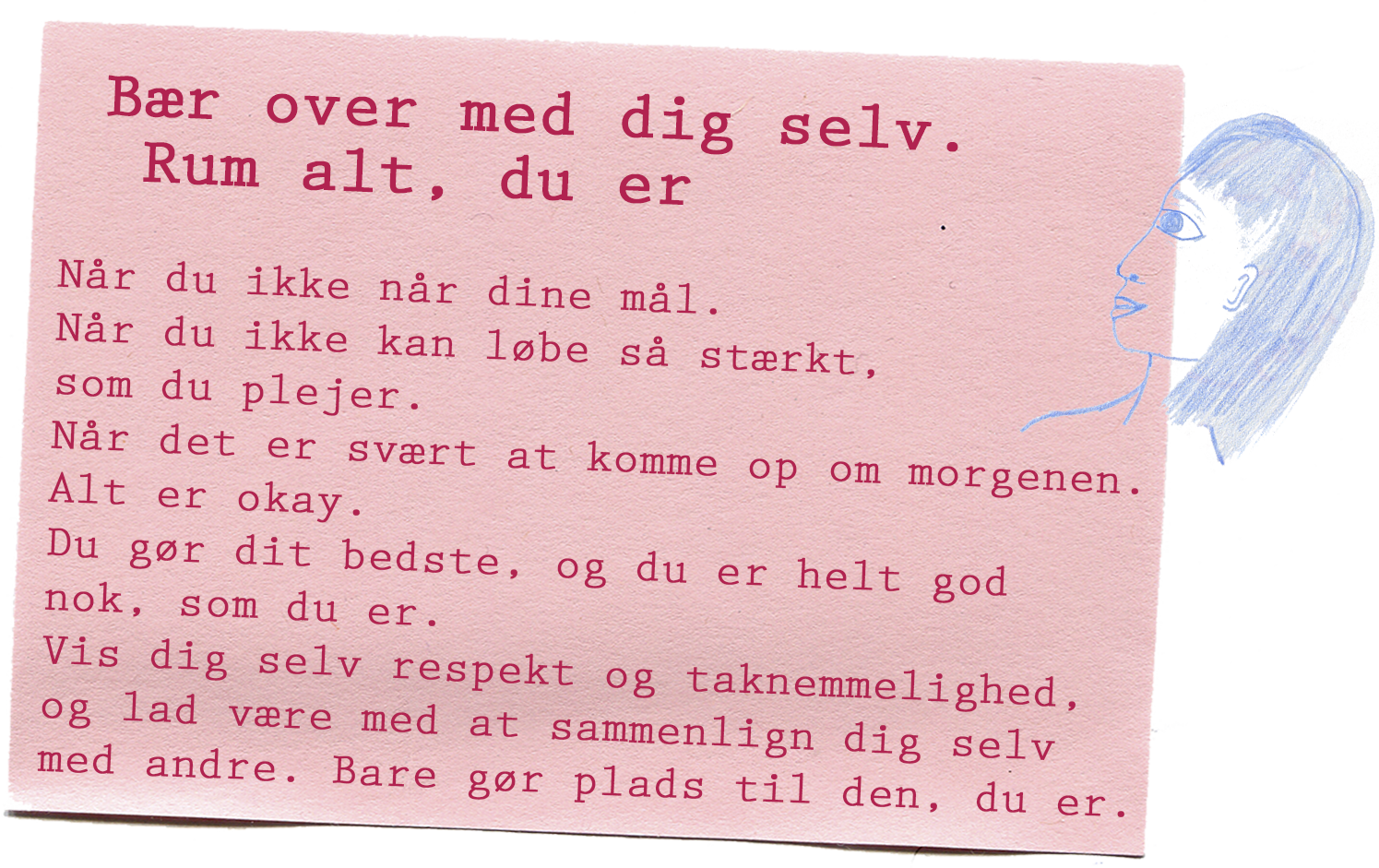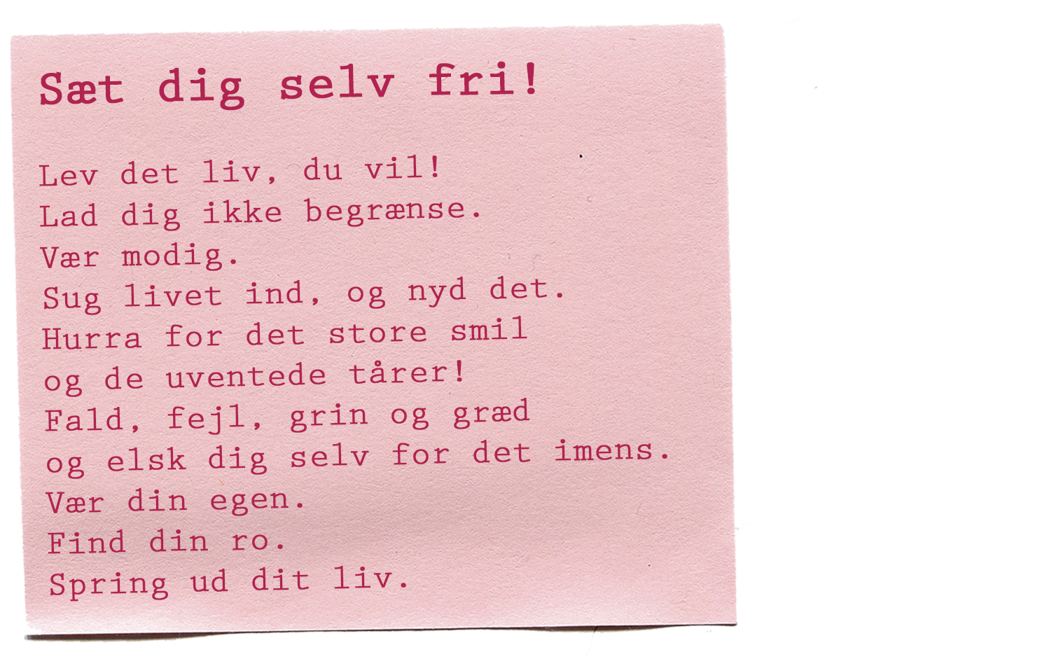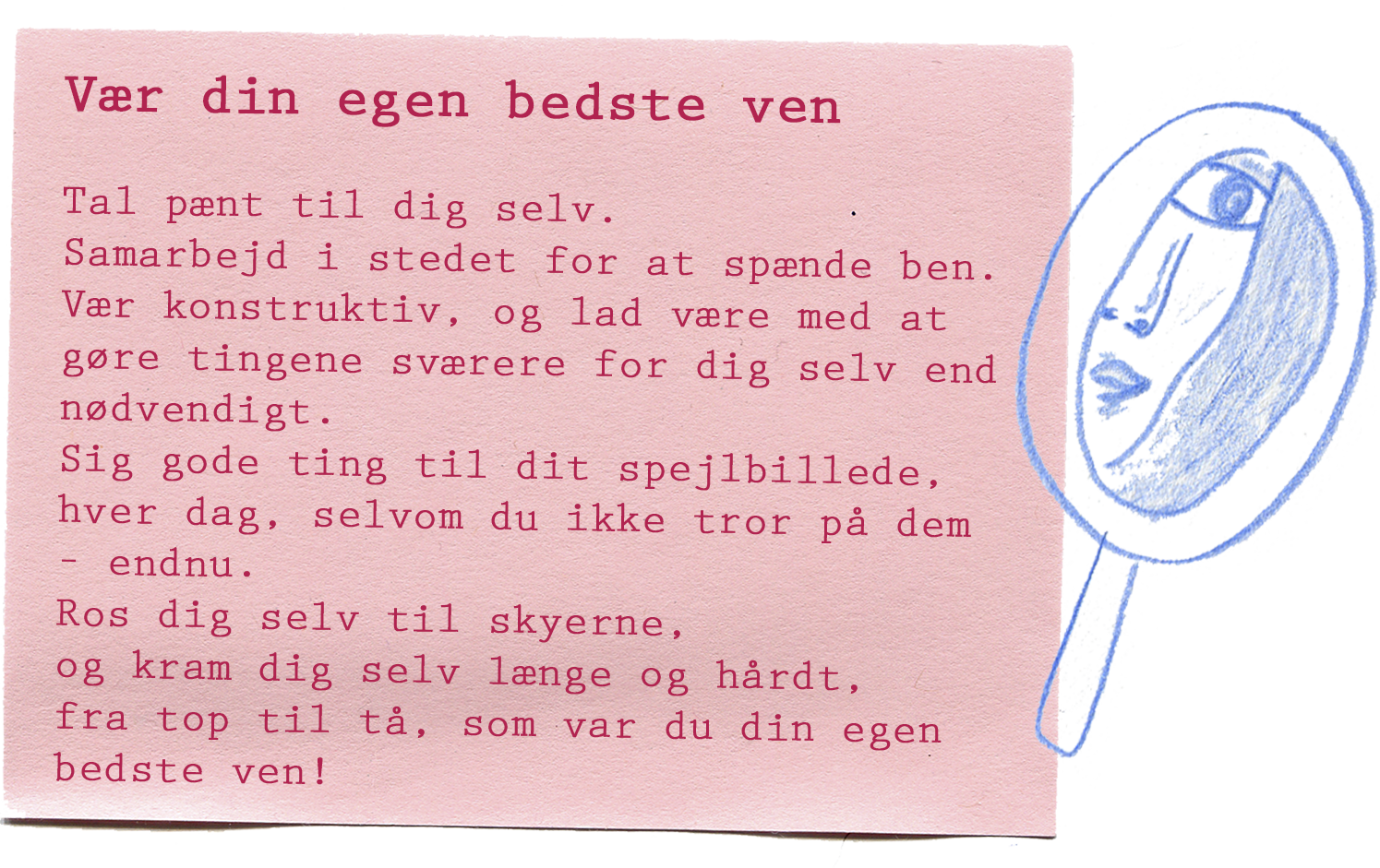 Mit liv er efterhånden blevet fyldt med motivational quotes og opmuntrende citater i alle afkroge: kalendere, dagbøger, mobilnoter, opslagstavler. For jeg er fastsat på at gribe alle de selvkærlige tanker, så snart de rammer mig og beholde dem til de tidspunkter, hvor det kan være svært at bevare netop denne selvkærlighed. Jeg øver mig hver eneste dag i at give mig selv et mere selvkærligt liv, hvor jeg har plads til at være den, jeg er, uden for meget unødvendig modstand og selvkritik. Jeg er trods alt den person, jeg skal bruge resten af mit liv med, så nu jeg har besluttet mig for at få det bedste ud af det!
