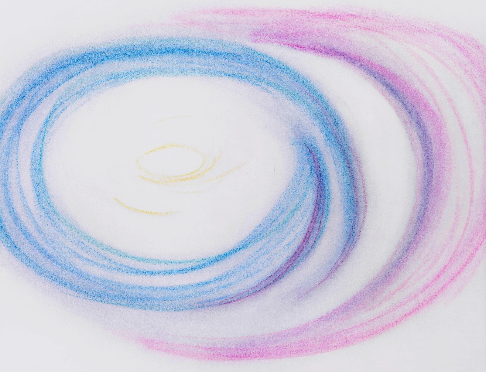 “Jeg lavede billederne hen over sommeren 2024, hvor jeg havde fået mit hjerte knust. Cirklerne tog naturligt form og var ret meditative at lave. Efterhånden forstod jeg, at det, jeg kreerede, var en fysisk manifestation af mødet, jeg havde oplevet; forelskelsen, sammensmeltningen, og til sidst bruddet – hvoraf jeg var vokset. Efter det stod jeg med erkendelsen af, at møder må være omdrejningspunktet for hele livet.”