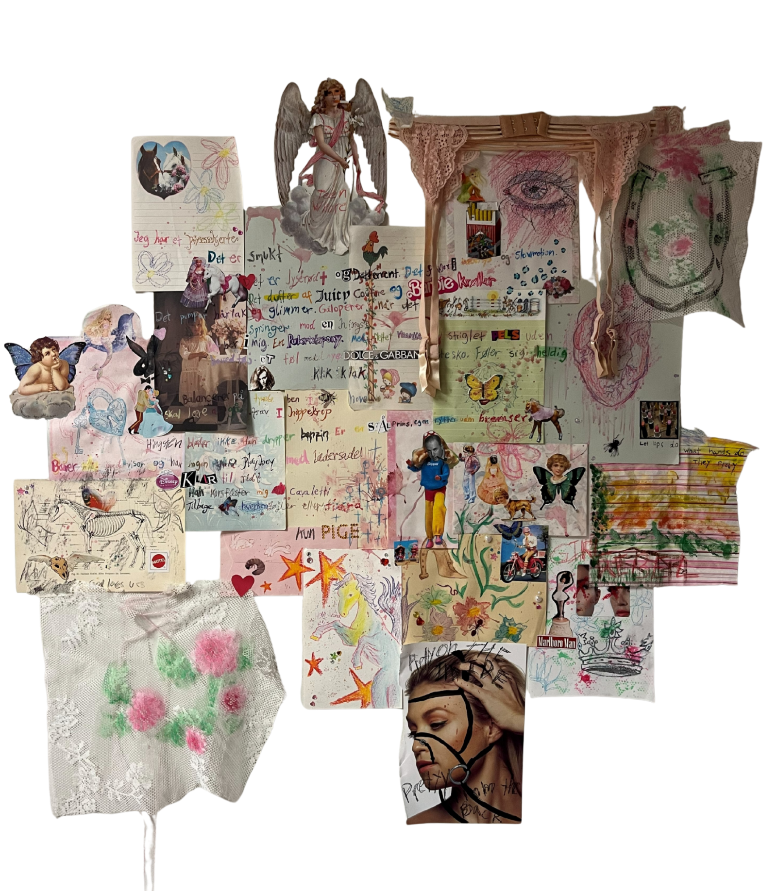 “Tøjler & Tiara er en collage, der undersøger overgangen fra pige til kvinde. Værket tager udgangspunkt i et selvskrevet digt, som også indgår i collagen. Jeg forestillede mig, hvad en teenagepige evt. kunne have hængende på sit soveværelse, hvorefter jeg intuitivt tilføjede elementer og lod mig inspirere af digtet.”