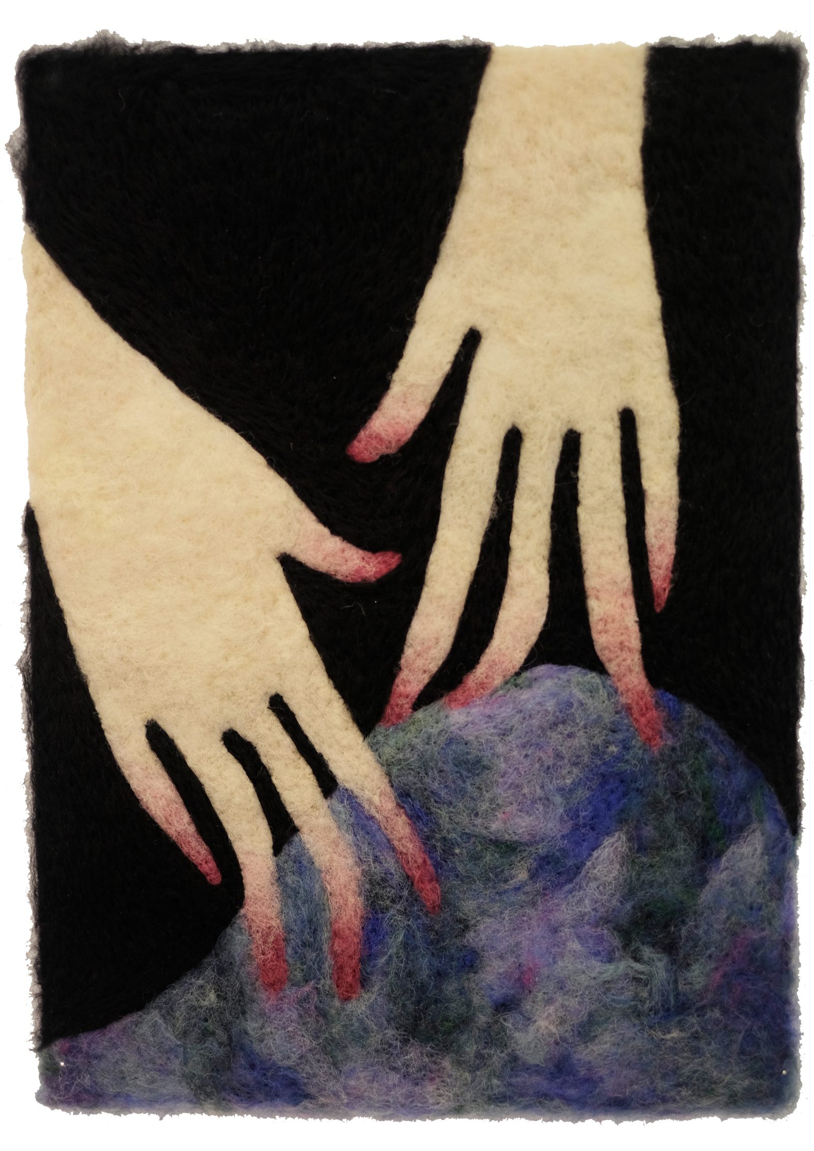 “Hænder er et genkommende motiv i min kunst. Det handler om længslen efter forbindelse, det giver sig selv, men det er også selve følelsen af materialet mellem fingrene og mod håndfladen, der hjemsøger mig. Jeg tænker, at det mest “fuck AI”-agtige man kan gøre er at røre ved noget – en væg, en fremmed kat, noget meget langt græs, sig selv – for det kan kunstig intelligens ikke. Måske er det derfor, den kunst AI skaber er så ringe. AI har ikke hænder. AI har aldrig bundet en mælkebøttekrans og mærket stænglernes klistrede saft sætte sig fast og størkne som en hvid hinde på huden.”