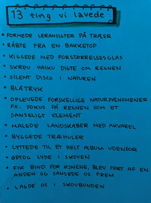 Gennem opgaver med forskellige æstetiske udtryksformer øvede vi os på at være nysgerrige og lytte til vores indfald, når vi var i naturen. I kraft af valgfaget og samtaler med min lærer, Nikolaj, lærte jeg, hvor stor en betydning, naturforbindelser egentlig kan have.