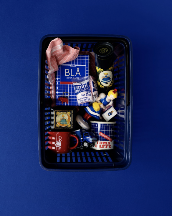 Den dybe koboltblå farve er bunden for hele udstillingen, som er malet på væggene fra gulv til loft, de fleste genstande i montrerne har samme farve og selv forklæderne ude i cafeen er mærket af dem. Designmuseet er gået all in på Irmas mærkevare, “Irma-blå”, som de selv beskriver den.