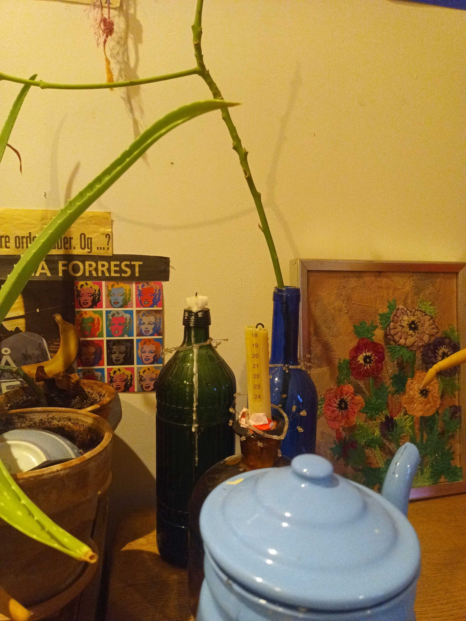Jeg spørger, om jeg må se hendes værelse, inden vi går mod Walker. Den 20-åriges værelse er én stor collage af papirklip, feministiske citater og hjemmelavet kunst fra årenes løb. Her står også et ubrændt kalenderlys, som jeg fniser lidt af. Hun supplerer, at det er flere år gammelt.