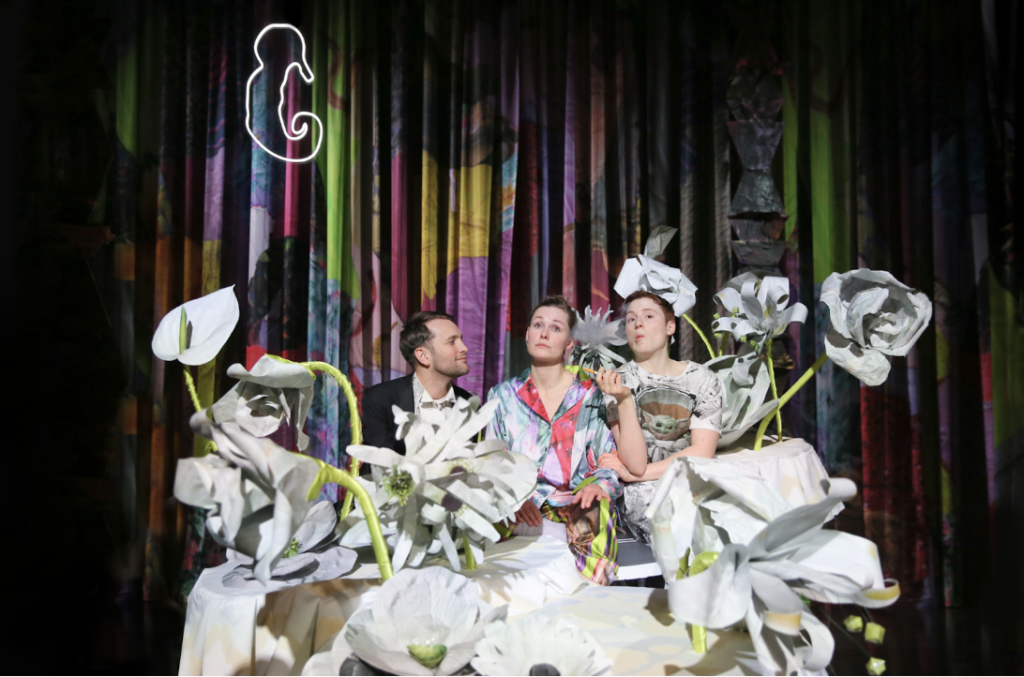 Det er gennemført og får min egne erfaringer med at lave teaterkulisser til at blegne og ligne det, det var: en efterskoleforestilling med diverse stofrester fra krealokalet. Scenografien her inviterer os ind i en neonfarvet hule, og vi fornemmer hurtigt, at vi er i trygge hænder hos skuespillerne.