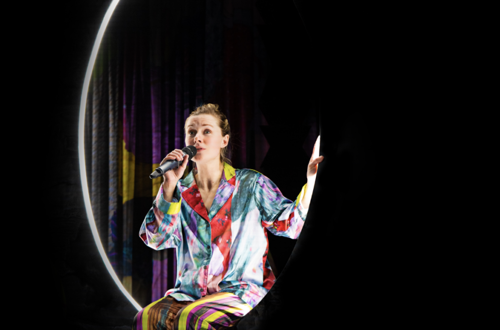 Lyset dæmpes i salen, og scenen er indrammet af lange, draperede og farvestrålende stykker stof. Sofie Torp toner frem i et sæt tøj, der matcher resten af scenen.