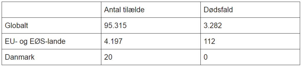 Det ville ikke være det samme indlæg, hvis jeg ikke dækkede coronavirus. COVID-19, en virus fra byen Wuhan i Kina, har spredt sig til flere steder i Asien, USA og Europa. Her i Danmark er mundbind og håndsprit blevet revet væk fra hylderne på apoteker og i Matas. Men er der grund til panik? Lige nu ser situationen sådan ud pr. 5. marts 2020.