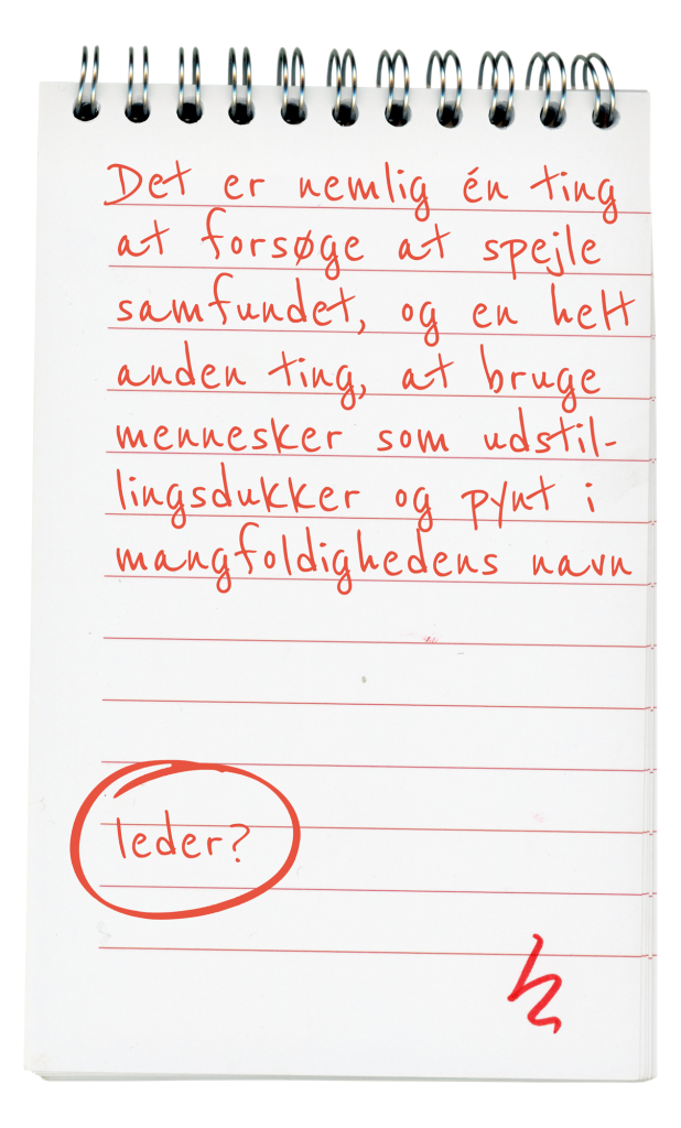 Det er nemlig én ting at forsøge at spejle samfundet, og en helt anden ting, at bruge mennesker som udstillingsdukker og pynt i mangfoldighedens navn.