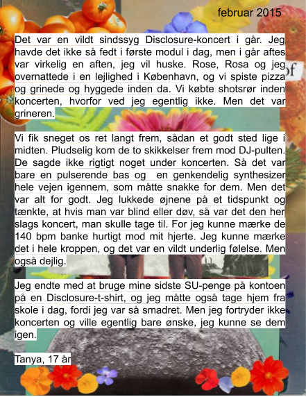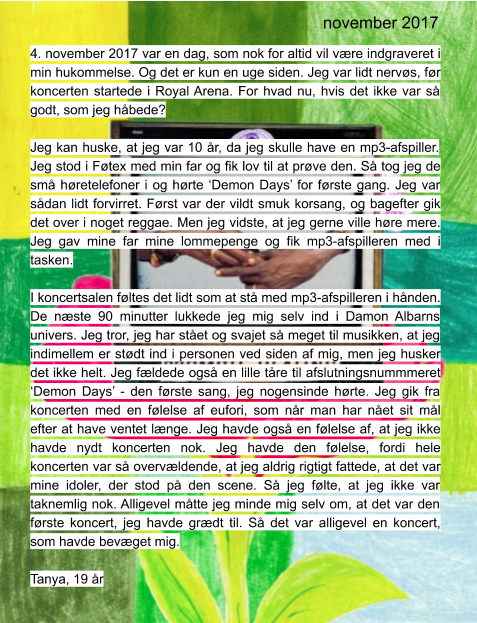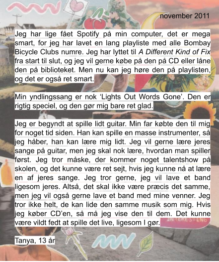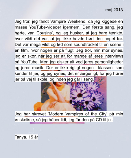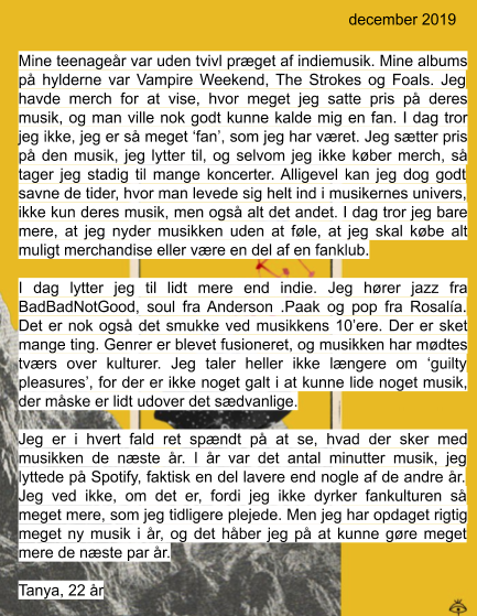 Spotify kan igen i år vise, hvilke kunstnere og sange man igennem året har lyttet mest til. Som afslutning på 10’erne kan man som noget særligt i år se, hvilke kunstnere der har dannet rammerne for ens musiksmag i dette årti. Måske har man lyttet til den samme genre i mange år, eller måske har man prøvet at eksperimentere med forskellige kunstnere. Tanya endte selv sit musikårti med forskellige kunstnere og genrer og har i form af kærlighedsbreve skrevet om nogle af de kunstnere, der har været vigtige for hendes musikårti.