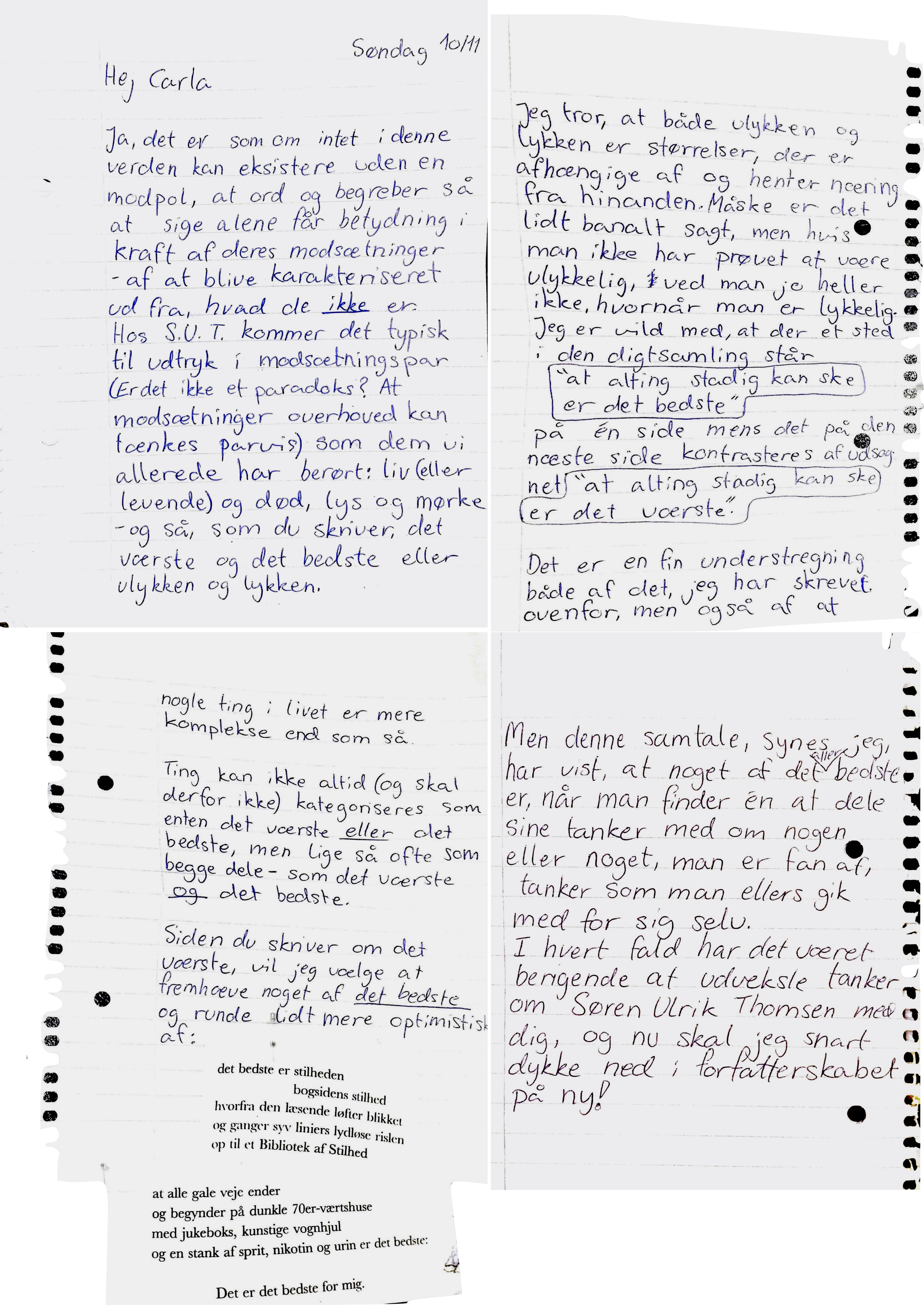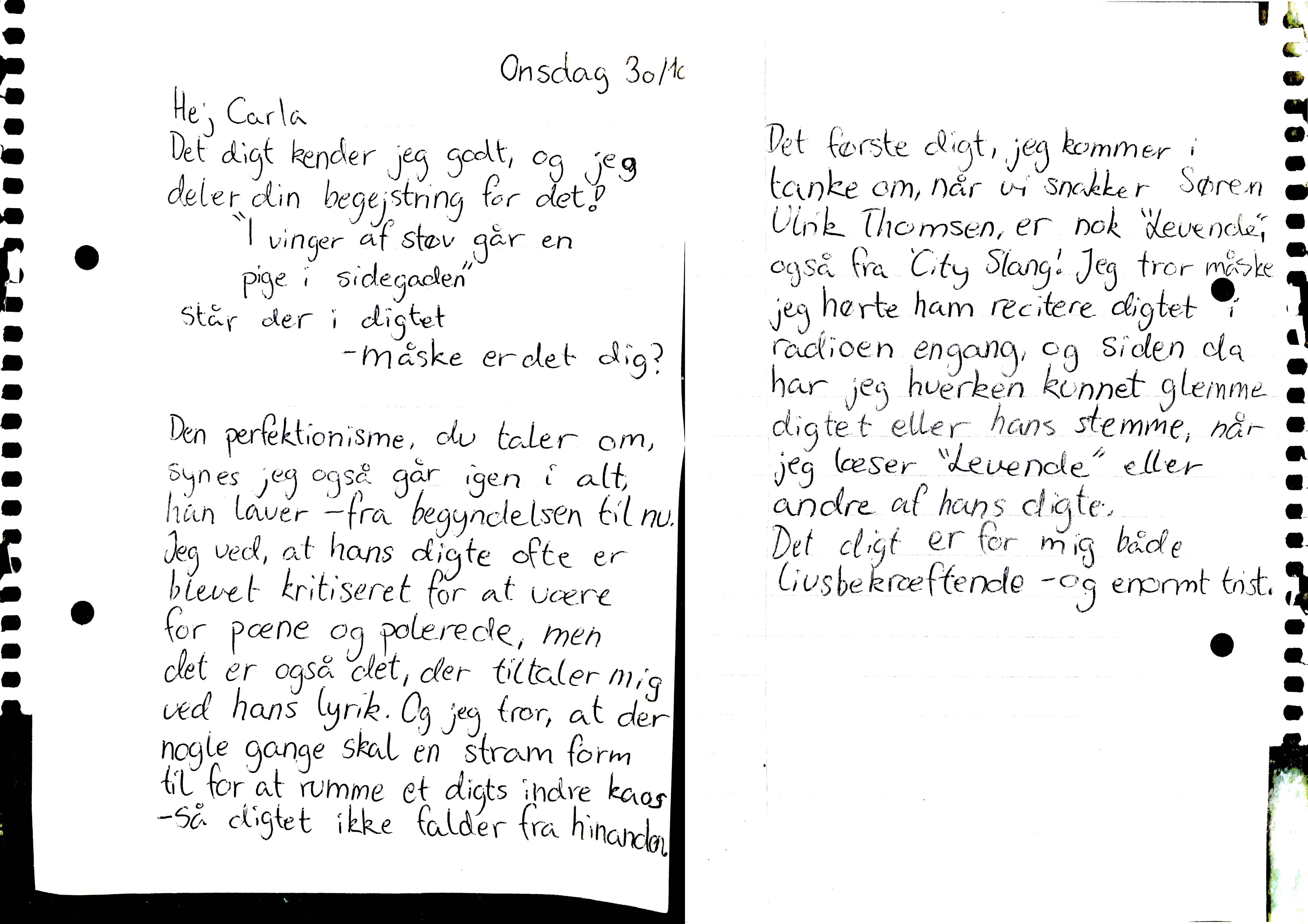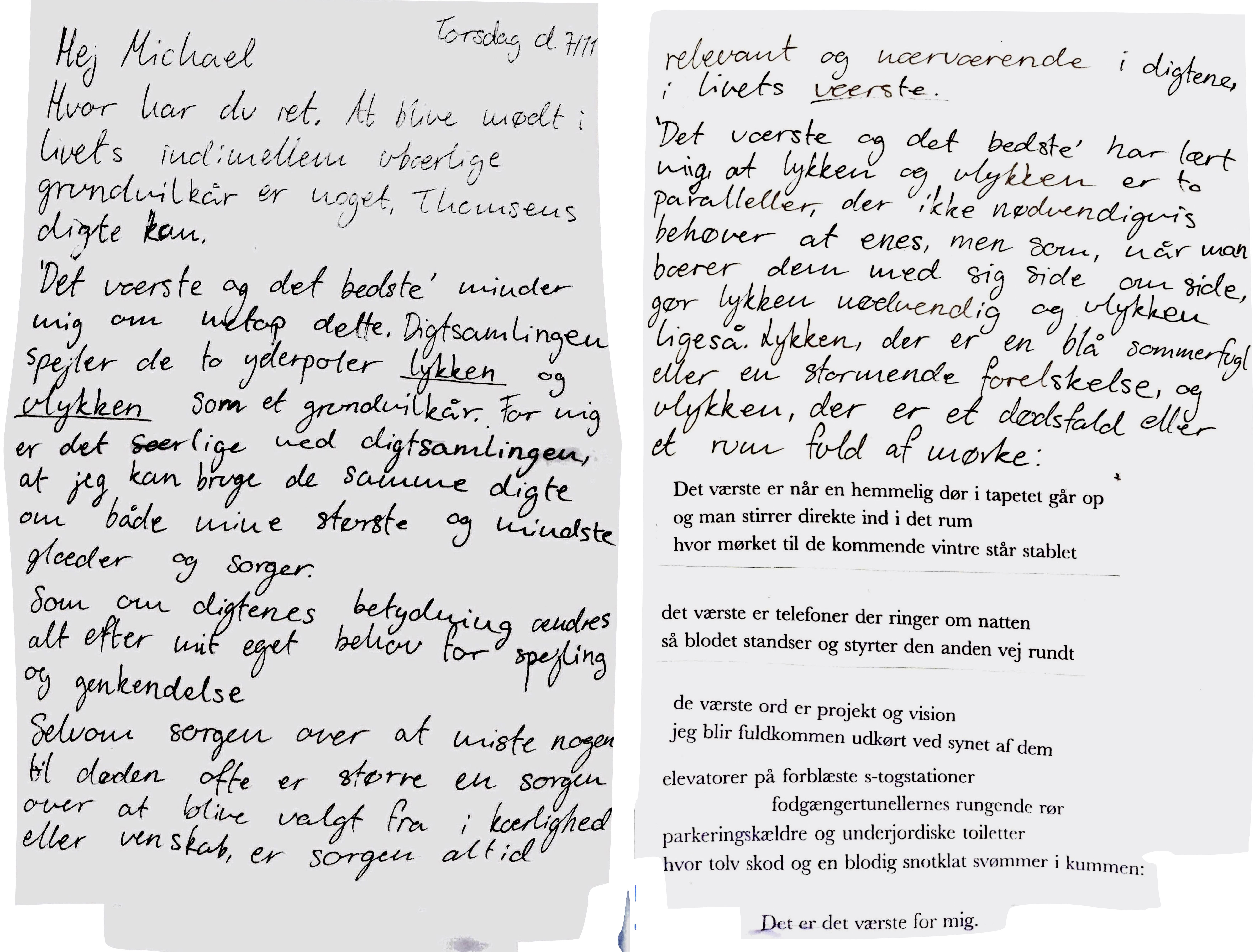Michael og Carla har delt deres tanker om digteren Søren Ulrik Thomsen med hinanden. Gennem en brevudveksling deler de deres fælles begejstring for digtenes skønhed, men undersøger også digtenes evne til at gribe dem begge i lykken, ulykken og dét, der lever derimellem.