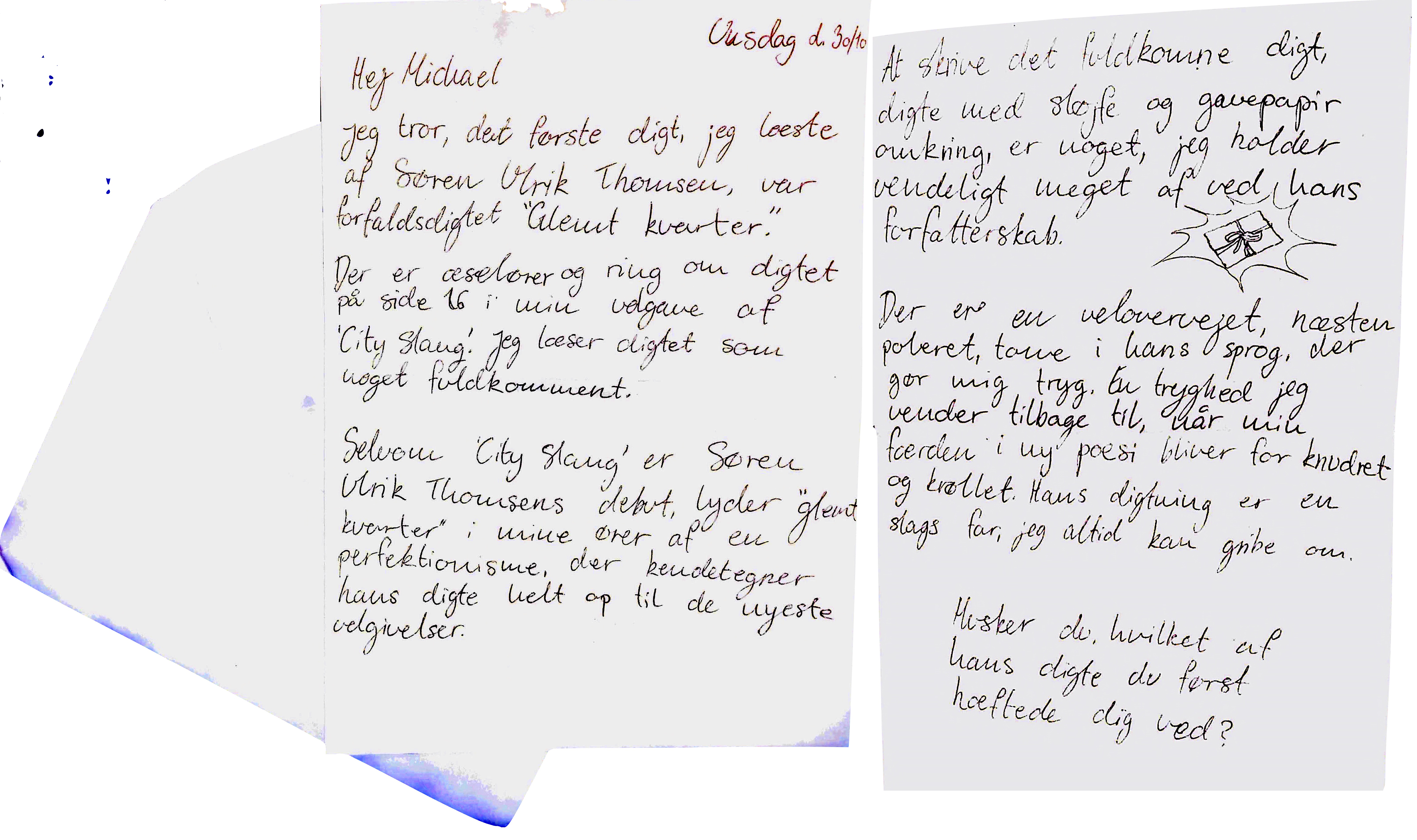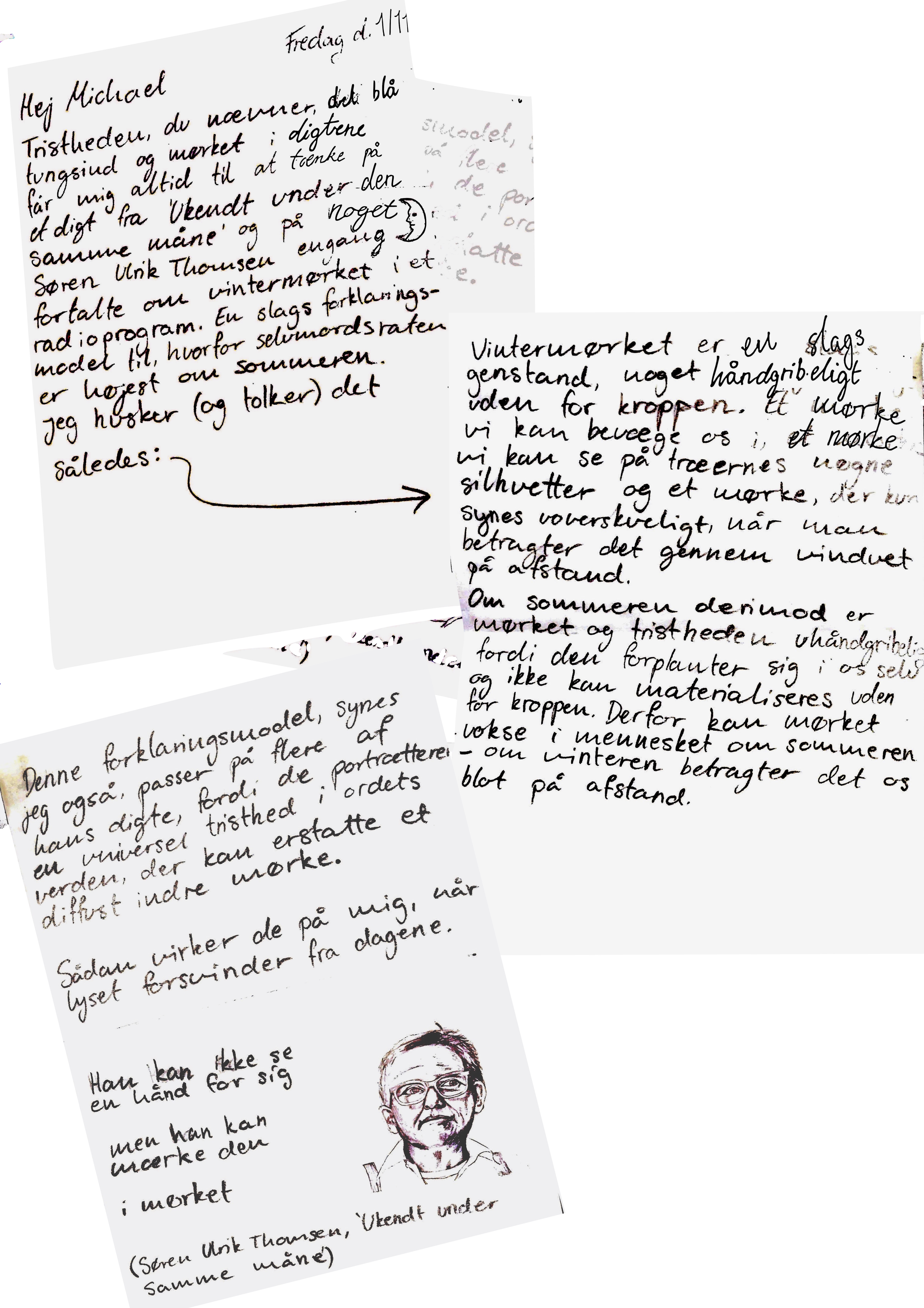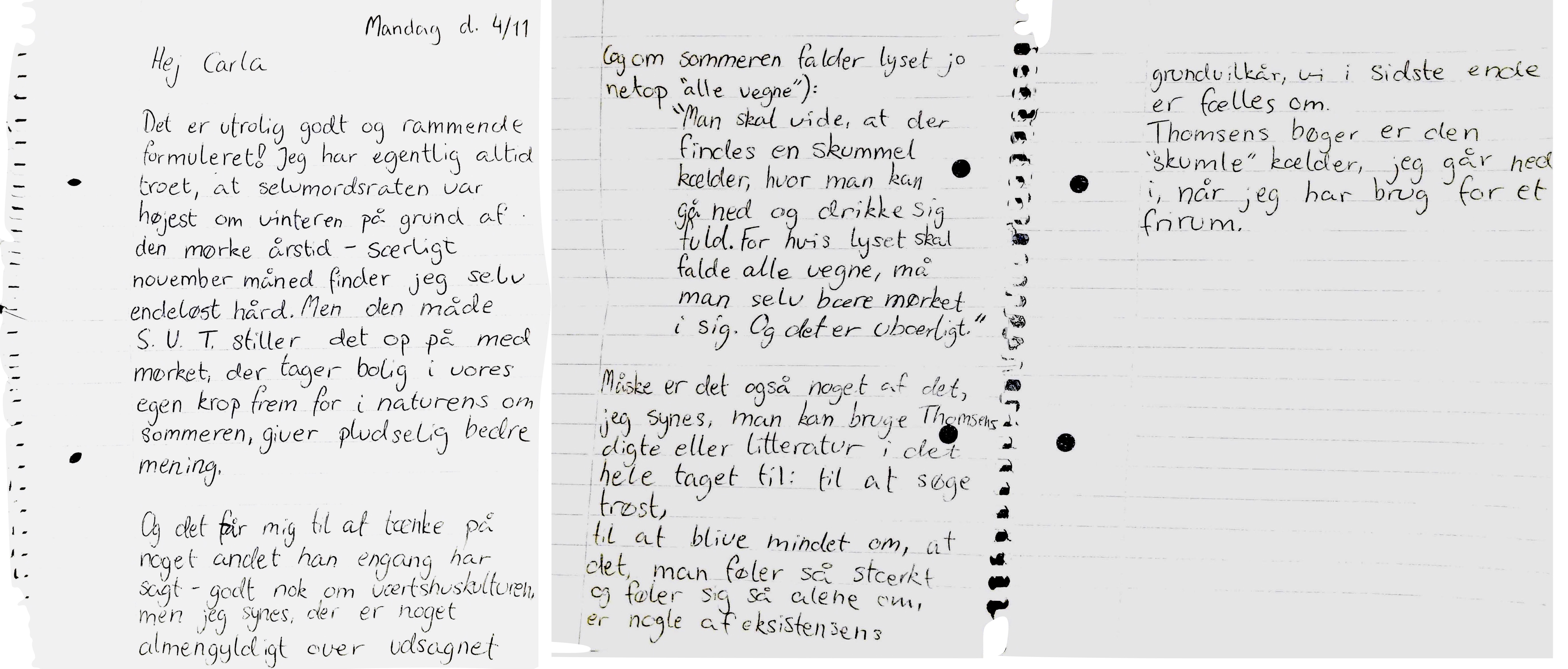 Michael og Carla har delt deres tanker om digteren Søren Ulrik Thomsen med hinanden. Gennem en brevudveksling deler de deres fælles begejstring for digtenes skønhed, men undersøger også digtenes evne til at gribe dem begge i lykken, ulykken og dét, der lever derimellem.