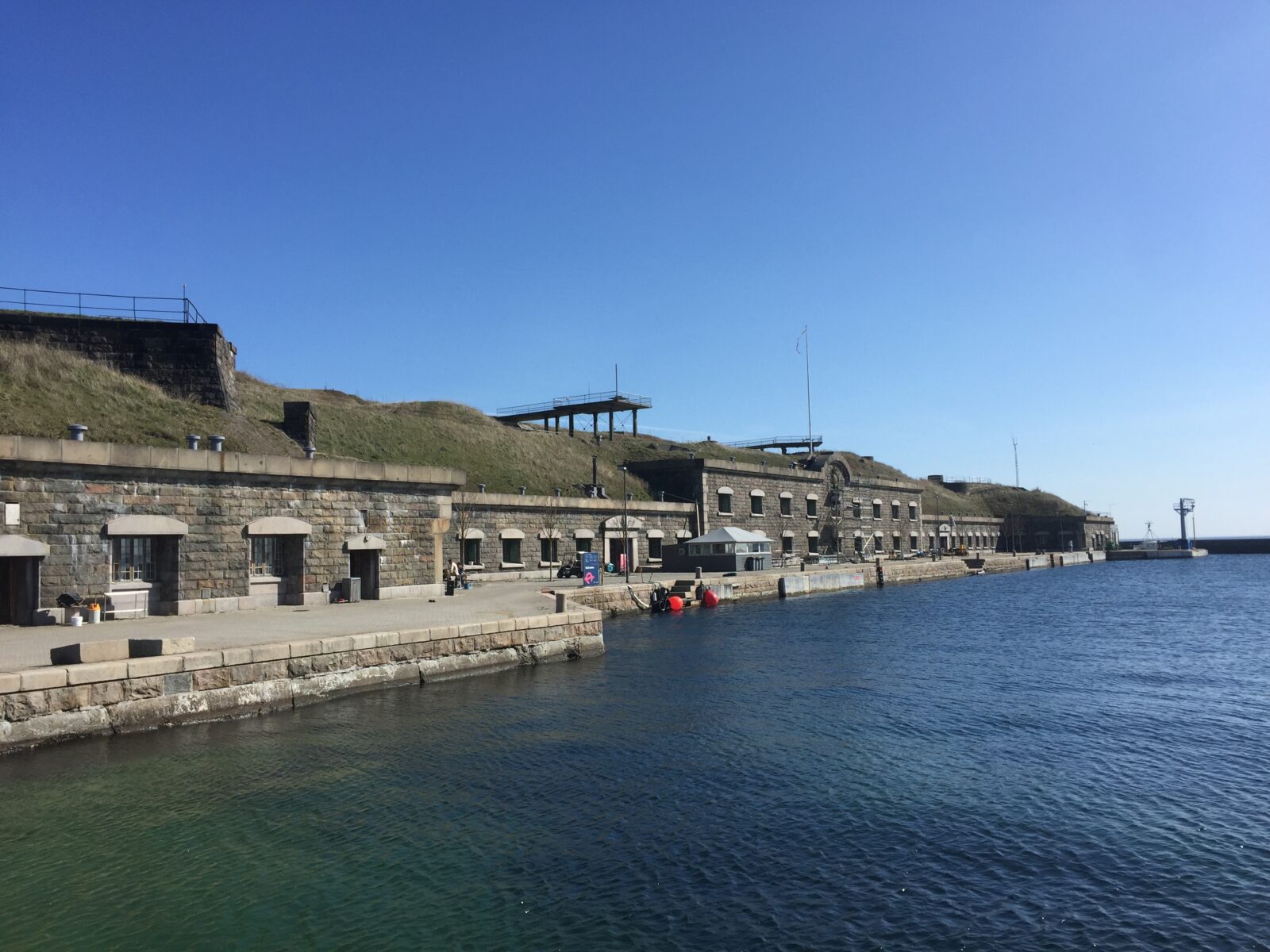 På kajen bliver jeg taget imod af Stine, som er en af fastboerne på øen. Hun kommer gående langs vandet med en kop kaffe, og bag hende rager den massive fortfacade op. Ved første øjekast er hun helt alene på øen.