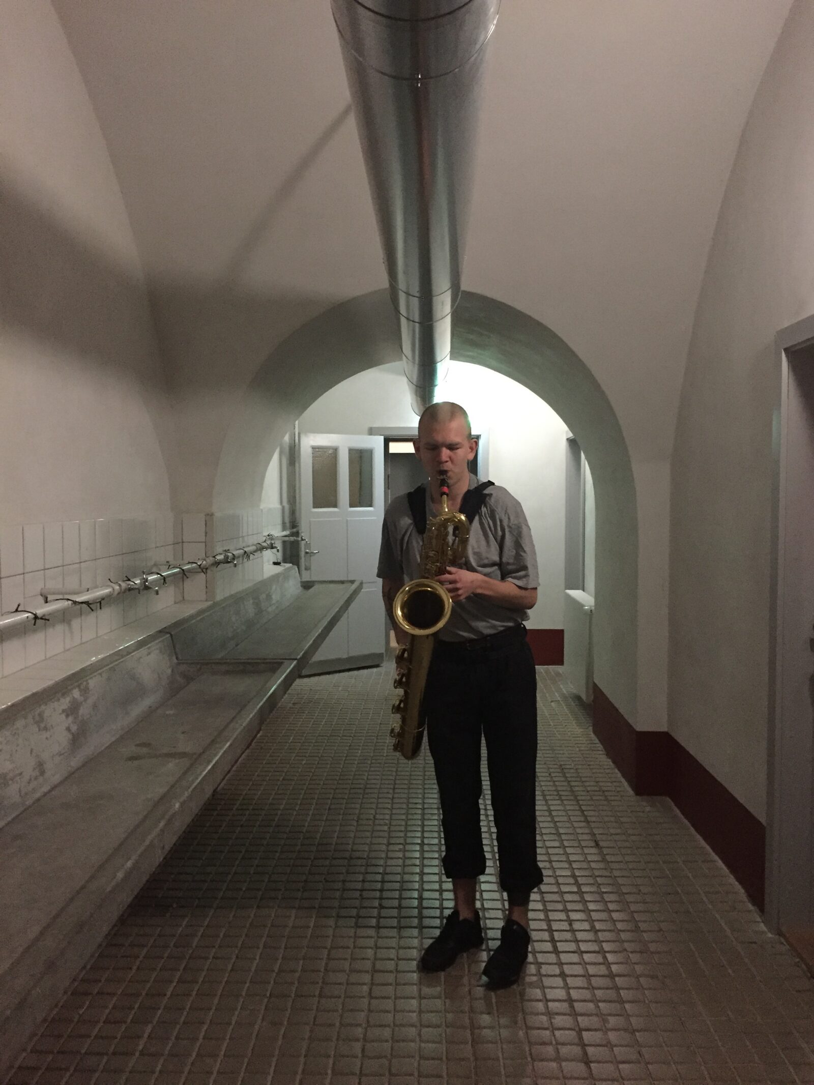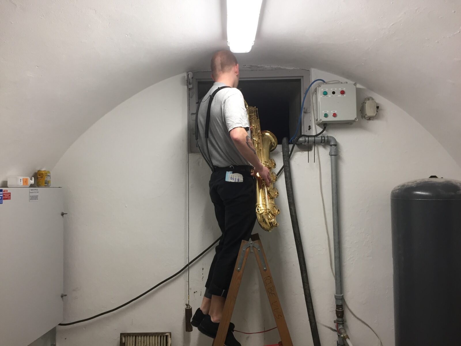 Han har dog fundet et hul fra en af de andre rum, som fører ind til vandtanken, og hvis han retter sin saxofon mod det, kan han få lidt af fornemmelsen af den rumklang, der er i vandtanken.