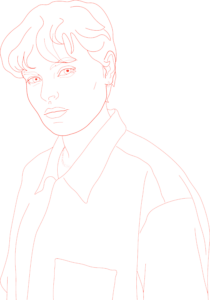 Portræt af forestillingens instruktør og dramatiker Leo Clara Mendes. Af Sigrid Langgaard.