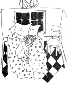 det tunge hår, vipperne, blyantspidse blyvægte på hans øjenlåg, håret der løber rundt om hans øre som vand rundt om en sten, kruseduller over hans bryst, tegnet færdig lige så hurtigt som han er kommet ind i mit liv, jeg er allerede begyndt at slide ham op og viske ham ud, katte ville vælge hviske, men jeg er en kruset dulle, panic ditzy scream girl, jeg hviner ham ud, ellers er jeg bange for at han kan høre hvad jeg siger