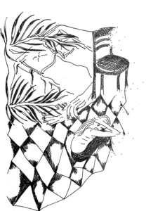 har altid været gumpetung, slæber fødderne hen ad gulvet, slæber bækkenet hen ad hans hofter, hans inderlår bliver til nedslidte gummisåler, huden gnedet til smuldret viskelæder, får farven af fløde som et jordbær har blødt i, jeg spidser min mund ind til en vandpistolsåbning og puster viskelædersmulderet væk som mælkebøtteblade