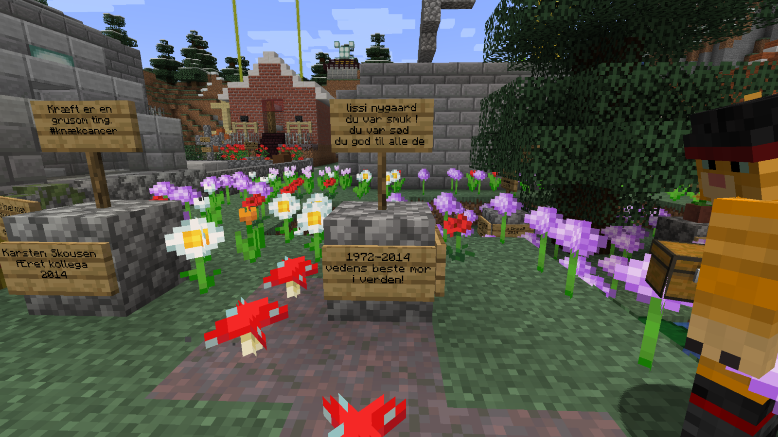 Man kan gennem Discord-forbindelsen høre, at han smiler, mens han fortæller det. Rasmus teleporterer mig med nogle kommandoer i spillet over til et afsides sted på serveren, hvor der står en ‘følelsesvæg’ i sten, som man anonymt kan skrive sine følelser på. Her skriver børnene om alt fra angst og familieproblemer til kærestesorger.