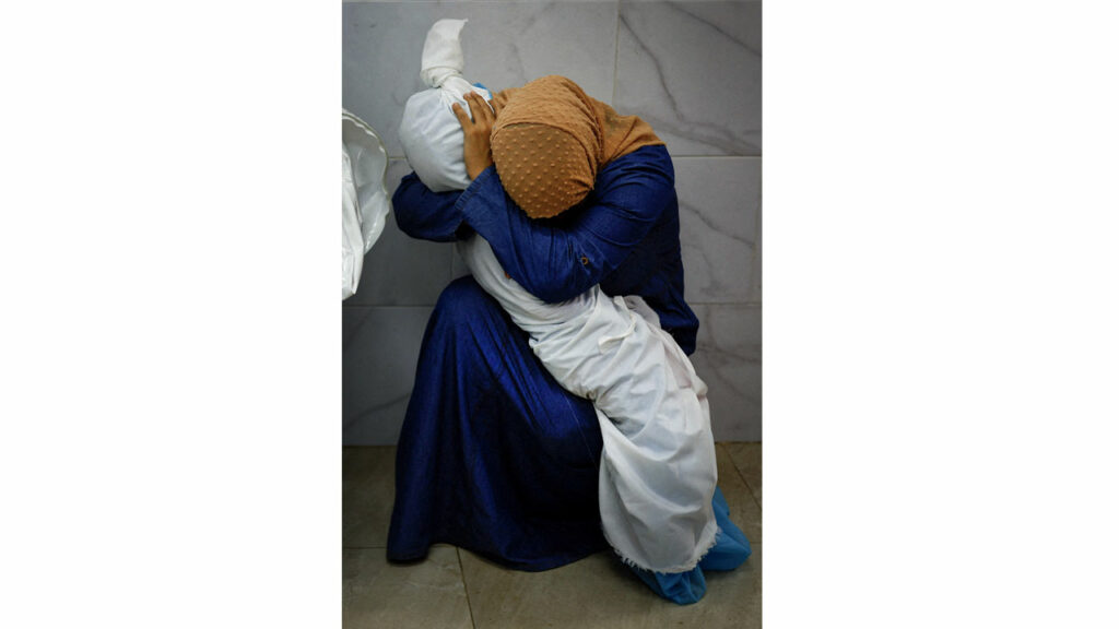 Billedet viser en lille pige svøbt i et hvidt klæde, der bliver vugget af sin moster. Hun blev dræbt sammen med sin mor og søster, da et israelsk missil slog ned i deres hjem i byen Khan Younis i Gaza.