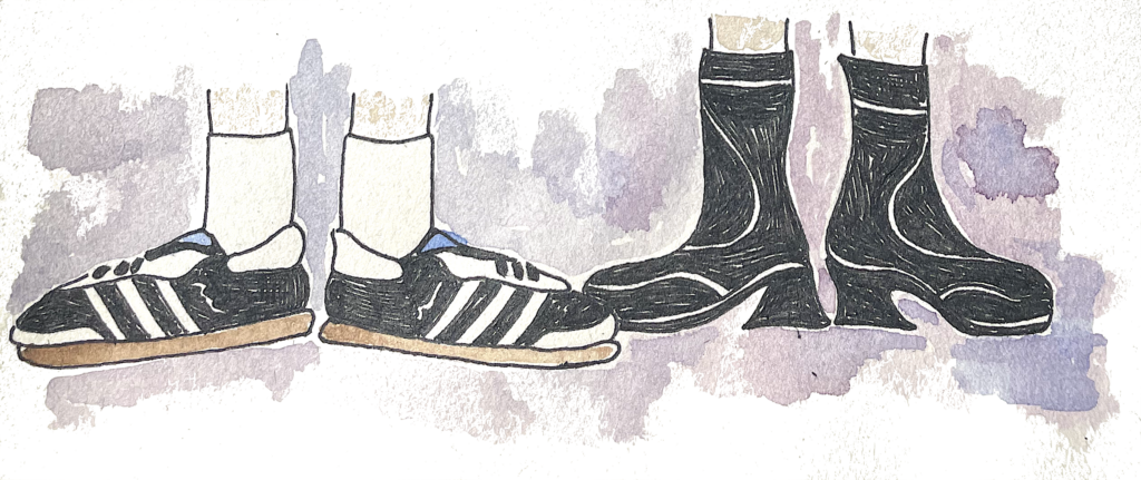 Vi ville ønske, at vi havde taget noget andet tøj med. Mindre praktiske jakker. Måske farvet håret inden vi kom. Alle her ligner raffinerede genbrugsshoppere i deres lækkert slidte læderjakker, affarvede jeans og krøllede mullets, der stikker ud under army caps. Vi diskuterer, hvad vi skal kalde SPOT-stilen. Det er ikke rigtig gorp core, som er lidt for pænt og ordentligt til at beskrive det sexede, uglede hår og elegante mascara-rester, vi ser her. Måske er det det, som Politiken for nylig kaldte poor core. Men det er ikke, fordi folk går i meget hullet tøj. Stilen er mere ‘jeg var ude at feste i går, faldt i søvn i mit tøj, vågnede og tog direkte til koncert’.
