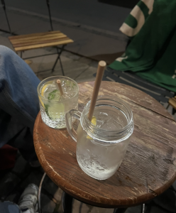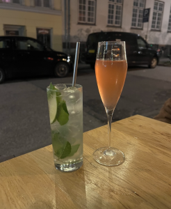 Drinksene koster 60 kroner, men udvalget er stort og godt, og drinksene forholdsvis stærke. Der er nogle hyggelige borde udenfor, hvor vi sætter os ned for at nyde vores mojito med abrikos og en slags rekonstrueret cosmopolitan med sake og blomme.