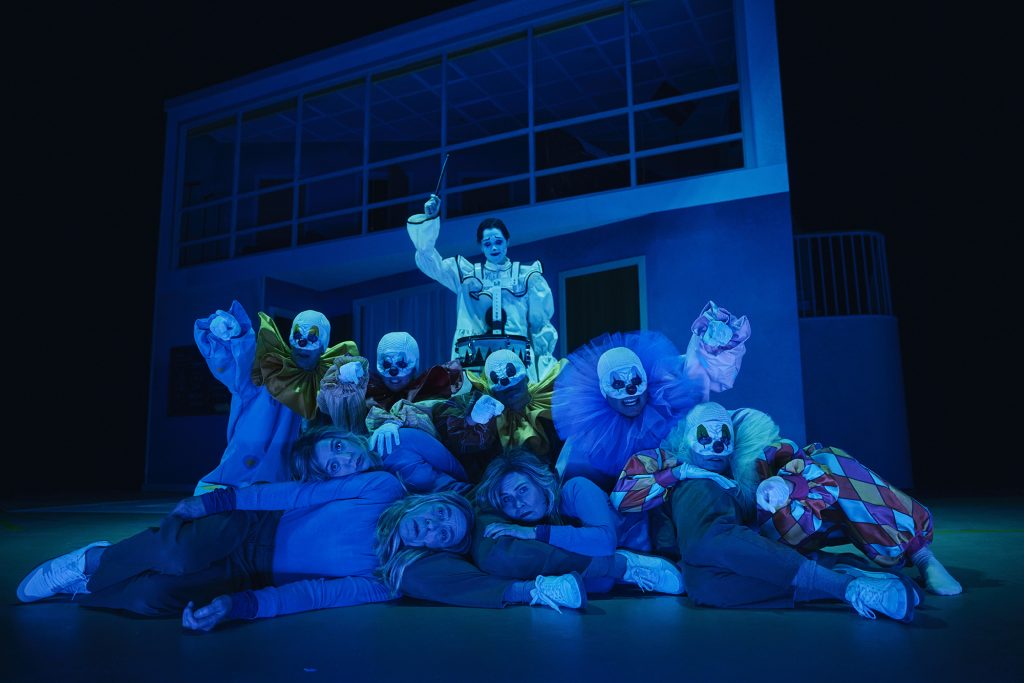 En af de ting jeg særligt godt kunne lide ved stykket var dets af og til dystre, nærmest mareridtsagtige sekvenser. Scenen blev forandret til en uncanny by af klovne, der koldt kiggede ud mod publikum uden at sige noget. Som en alvidende gud, med egne følelser og drømmer får vi hele stykket fortalt af en klovn spillet af Søren Torpegaard Lund. Særligt hans performance imponerede mig. Ikke nok med at han af og til næsten skræmte livet af mig med sin killer clown-agtige eksistens på scenen, leverede han nogle af de mest imponerende vokaler jeg længe har hørt live. En dyster og teatralsk version af Bim Bam Busse tryllebandt publikum i starten af stykket og satte standarden, for hvad vi ellers havde i vente.