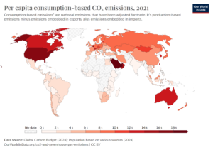 Udledning per indbygger er ikke det sidste stop på vores lille data-verdensturné. For én ting er, hvad landets samlede udledning via dets produktion bliver, når man fordeler den blandt alle dets borgere. En anden ting er, hvad disse borgere selv forbruger, og hvor meget af denne produktion der i virkeligheden går til forbruget af andre landes borgere.