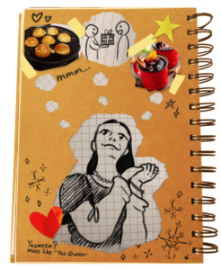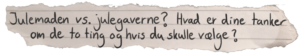 Yasmeen: Maden. Som Anne nævner er processen bag maden – at handle ind, tilberede, spise og rydde op – langt mere hyggelig og jule-agtig end processen bag julegaverne.