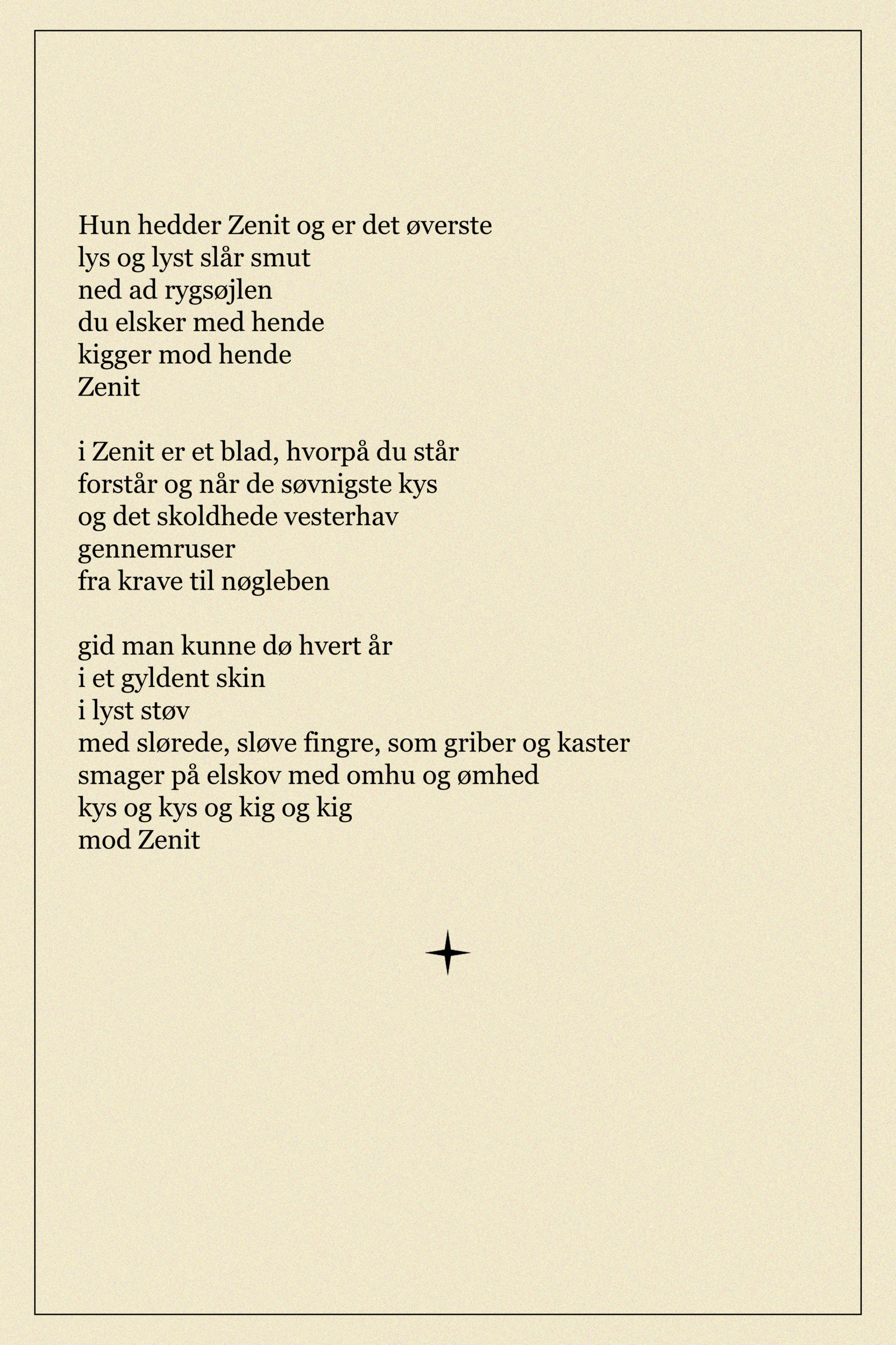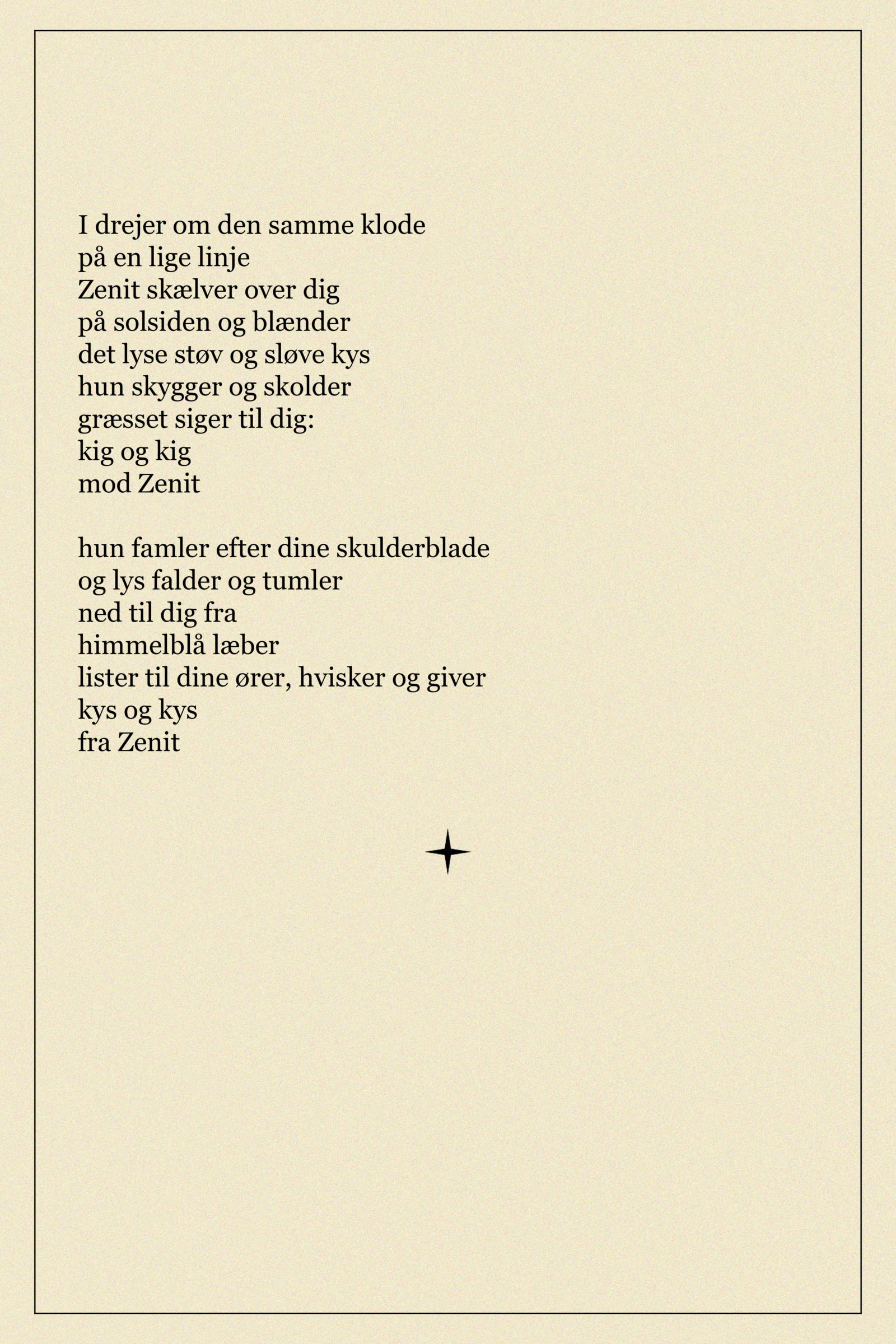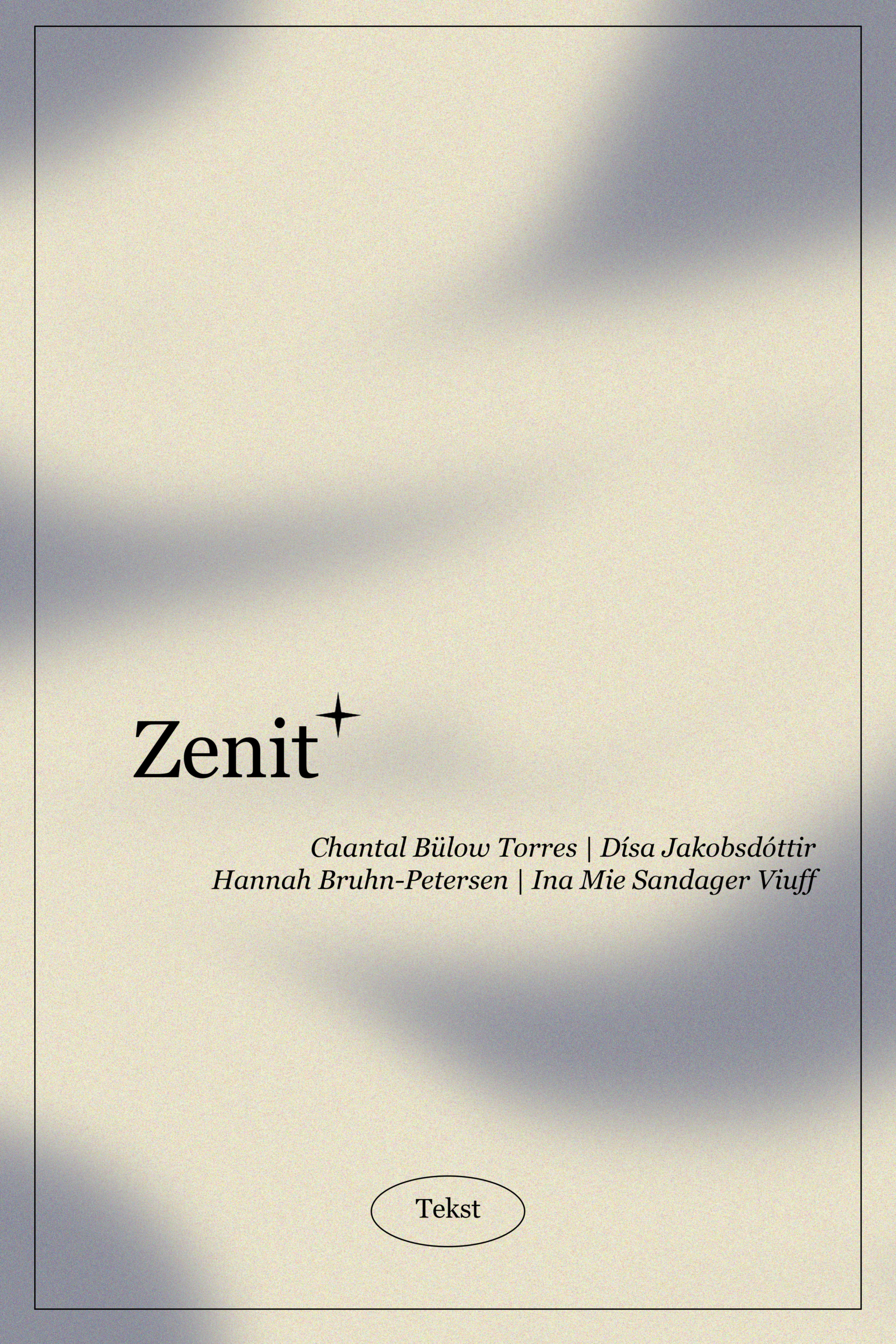 Zenit er et punkt på himlen lodret over iagttageren, som Ina har skrevet et digt om. Digtet er skrevet med udgangspunkt i Dísas fotografi af Hannah. Chantal har lavet grafisk opsætning af Inas digt Zenit.